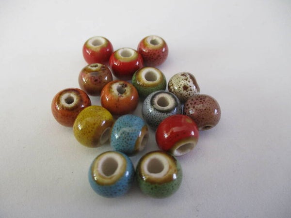 Ronde keramische Spacer Kralen van 10 mm groot met een 3 mm groot rijggat. Het is een mix van kleuren en soms zitten er wat onregelmatigheidjes in de afwerking. Door het materiaal, de kleur en de afwerking hebben ze een meer natuurlijke uitstraling.