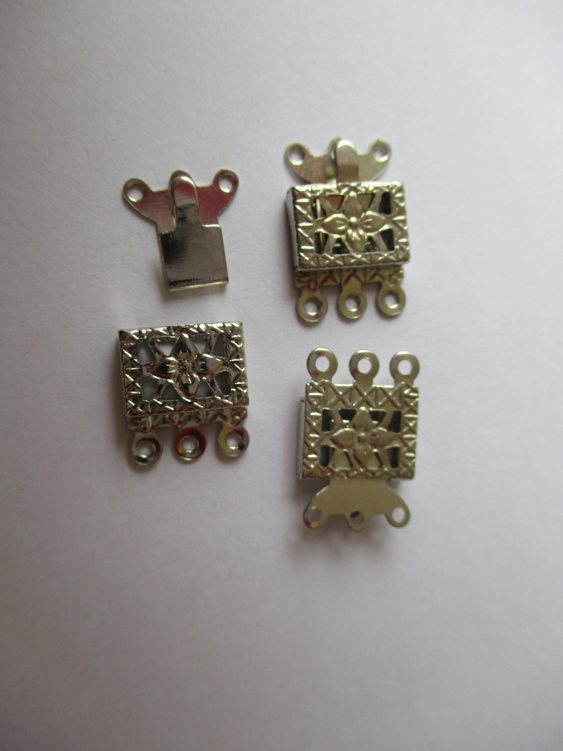 Een fijn afgewerkt zilverkleurig schuifslot (bakslot) gemaakt van dun nikkelvrij metaal. Het slot is gemaakt voor een sieraad van 3 draden, bijvoorbeeld voor kleine kraaltjes.