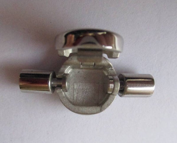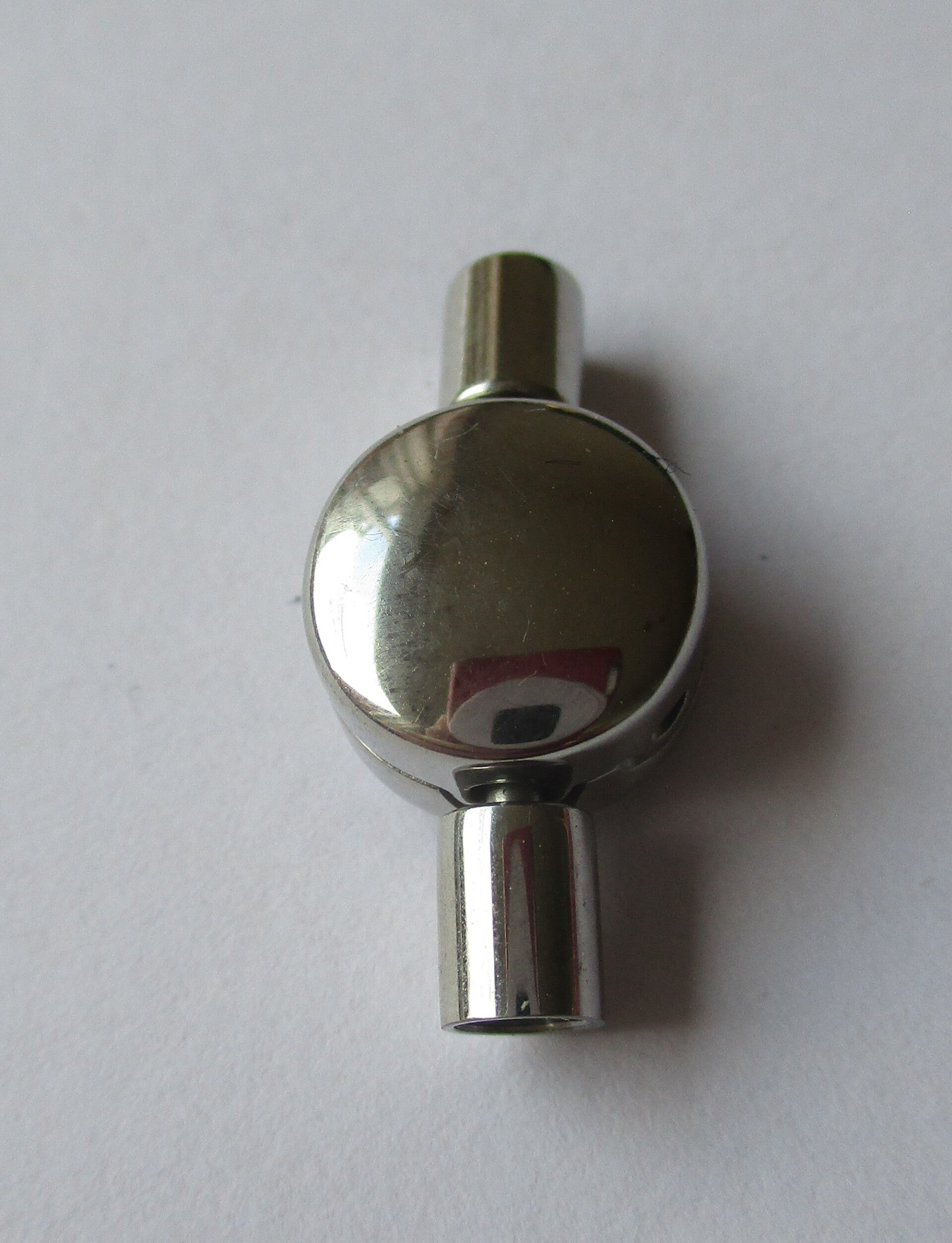 Het is een rond klepje met een scharniersluiting. Daarin zitten 2 koordkappen, waarvan 1 aan het klepje vast zit. De andere kan er uit om een ketting los te kunnen maken. Het is geschikt voor koord van 2,5 mm dik.