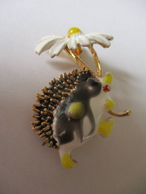 Het heeft de vorm van een egeltje die een bloem draagt. De broche is 3,5 x 2,5 cm groot en is er in twee kleuren, oranje en geel.