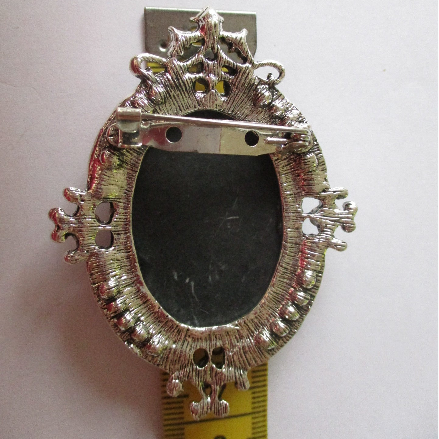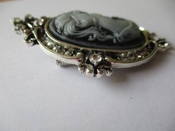 Een opvallende klassieker, een grote broche met grijs met witte camee. In de rand van de broche zijn stras steentjes verwerkt, voor een beetje glinsterend effect.