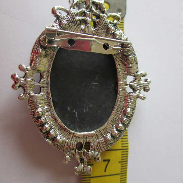 De broche is 6,8 x 5 cm groot, het heeft geen veiligheidsslot.