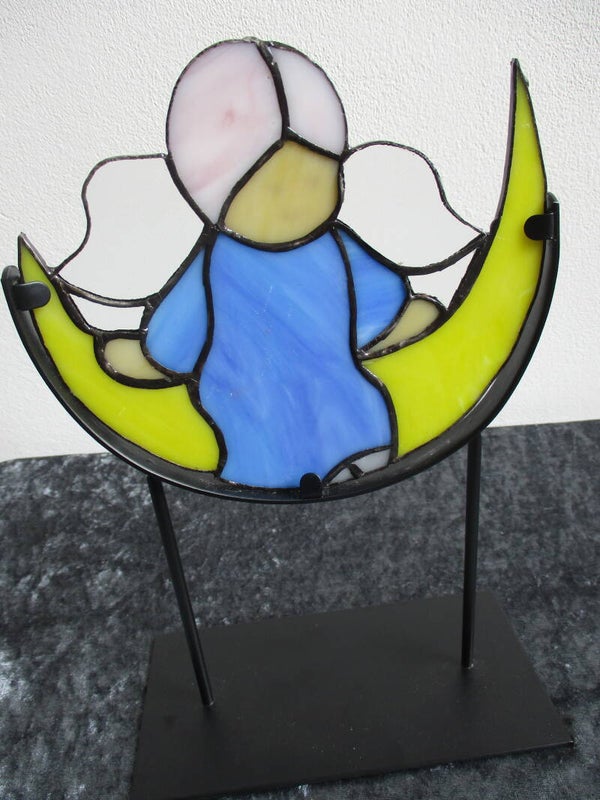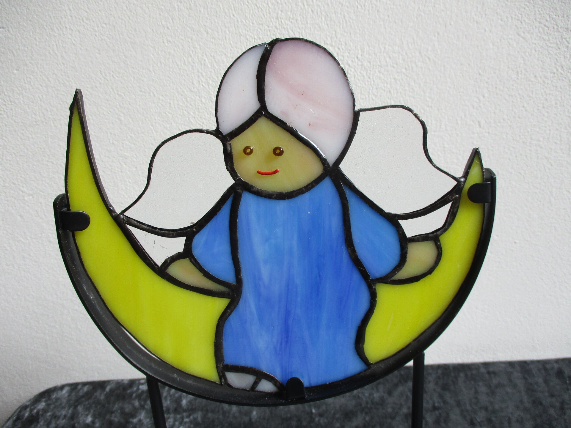 Een schattige glasdecoratie van 25 x 18 cm groot. Een halfronde zwarte metalen standaard met daarin een engeltje gemaakt met de Tiffany techniek. Het gezichtje, de oogjes, neus en mond zijn er op gefused.