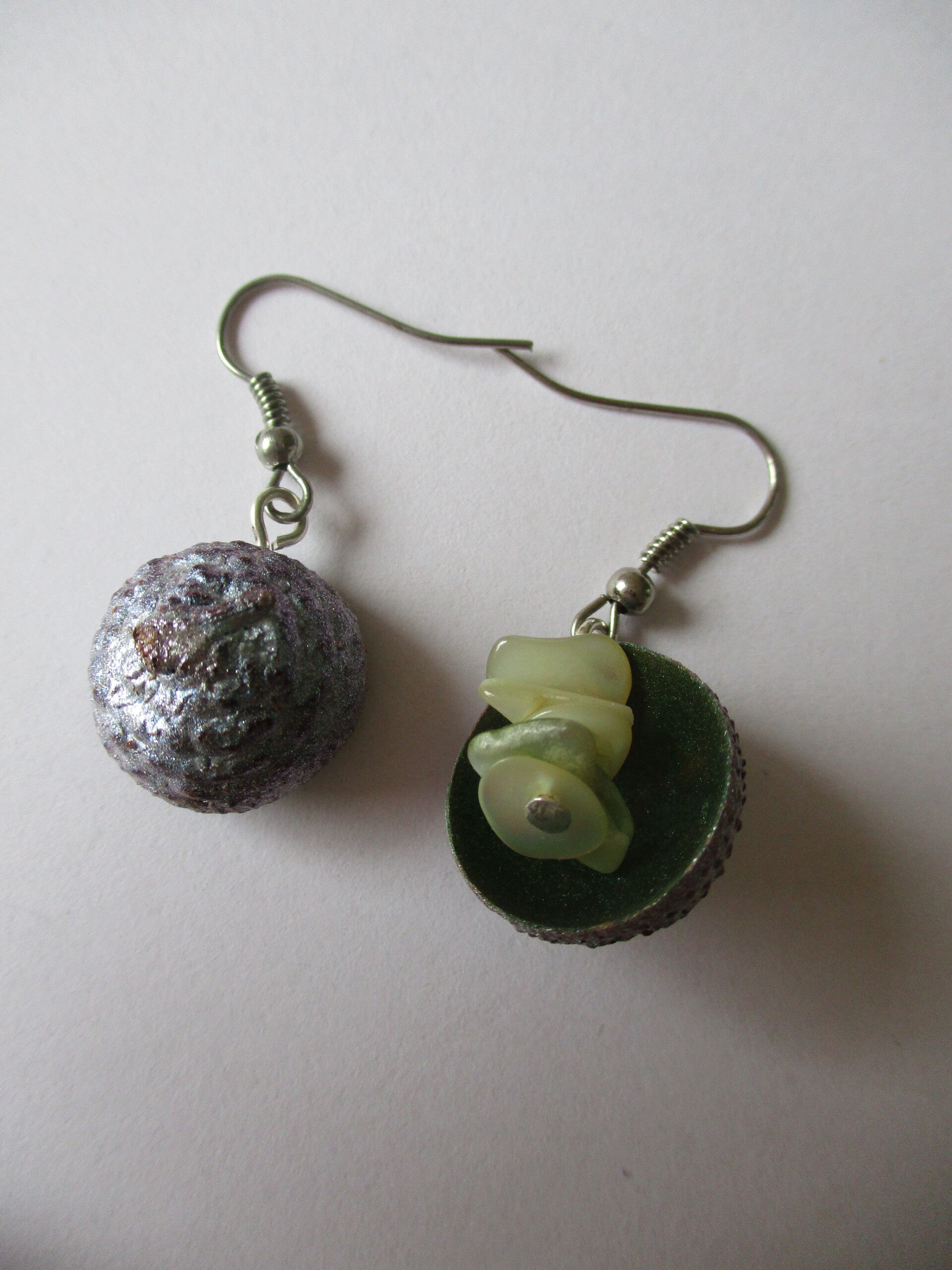 Eikelkapjes zijn de basis voor deze oorbellen. De kapjes zijn aan de binnenkant groen gelakt. De buitenkant is een beetje zilverkleurig gelakt. Aan de binnenkant is een rijtje met platte groene schelpkralen gemaakt. Het geeft een leuk natuurlijk effect.