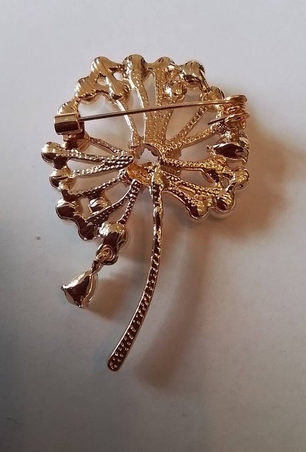 Een elegante broche die op veel kleding past. De broche is gemaakt van goudkleurig nikkelvrij metaal en is versierd met witte kunststof pareltjes met in het midden wat kleine stras steentjes. De broche heeft geen veiligheidsslot en is ongeveer 50 x 35 mm groot.