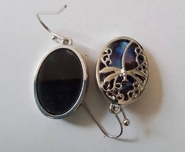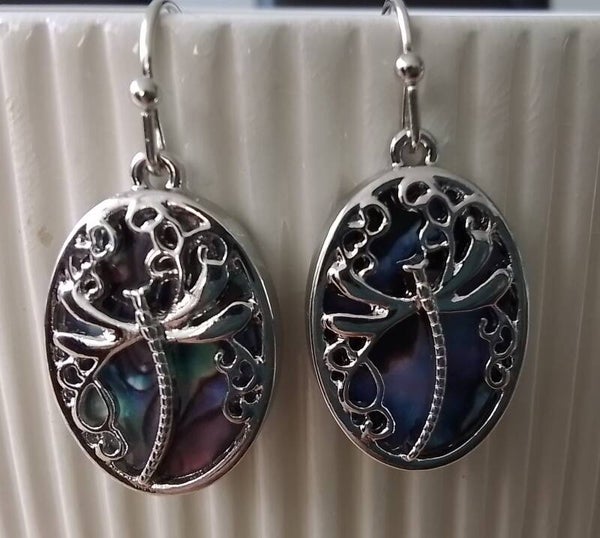 Mooi afgewerkte oorbellen met een verzilverd frame waarin een stukje abalone schelp is verwerkt. De schelp geeft een bijzonder kleureffect aan de oorbellen. In het frame is een soort libelle gemaakt.