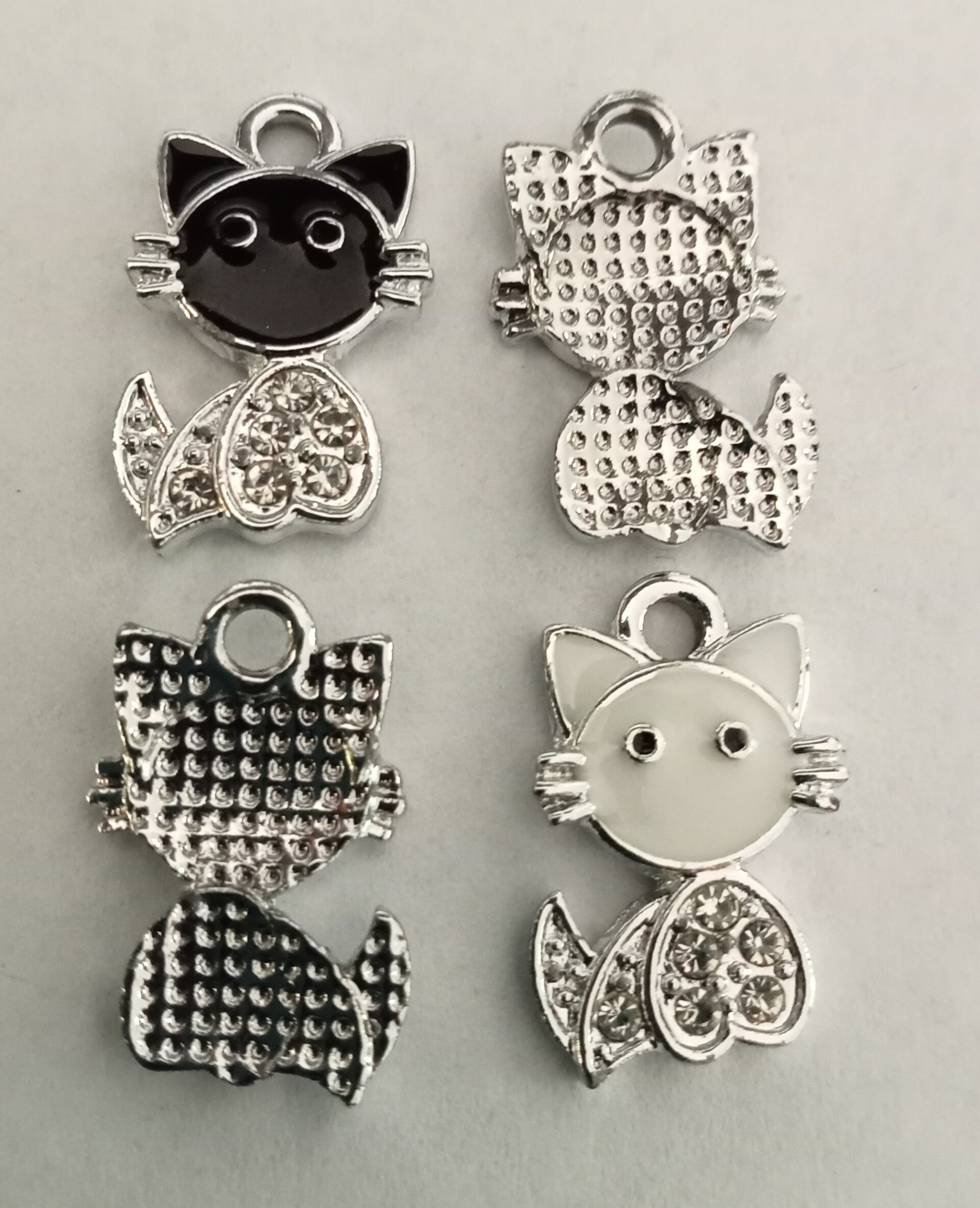 Leuke bedels van een poes met een wit of zwart kopje. Op het lijfje zijn kleine kristalletjes verwerkt. De bedels zijn 18 x 12 mm groot en gemaakt van nikkelvrij metaal.