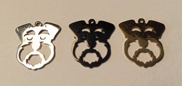 Roestvrij stalen bedels in de vorm van een Franse bulldog. De bedels zijn 17 x 16 mm groot en zijn zilverkleurig, goudkleurig en zwart.