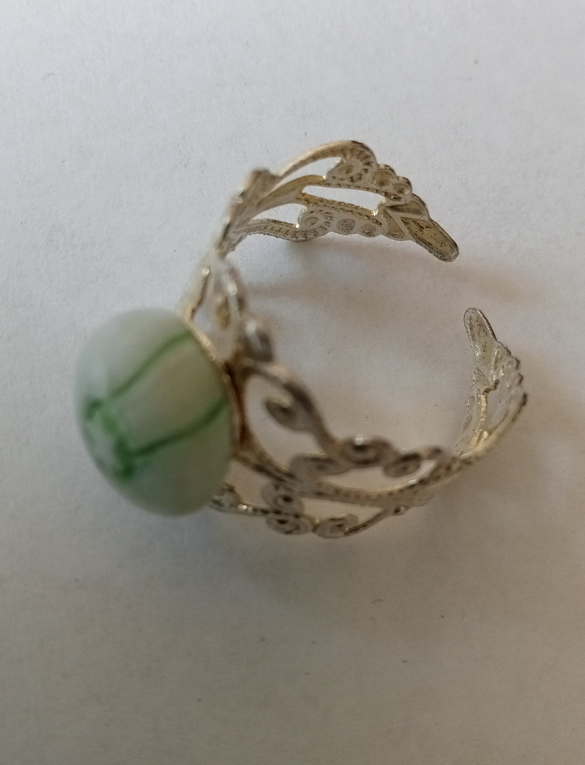 De opengewerkte ring lijkt een beetje op filigraan, het geeft een sierlijk effect. De top is gemaakt van wit glas met een groene milifiori erin.