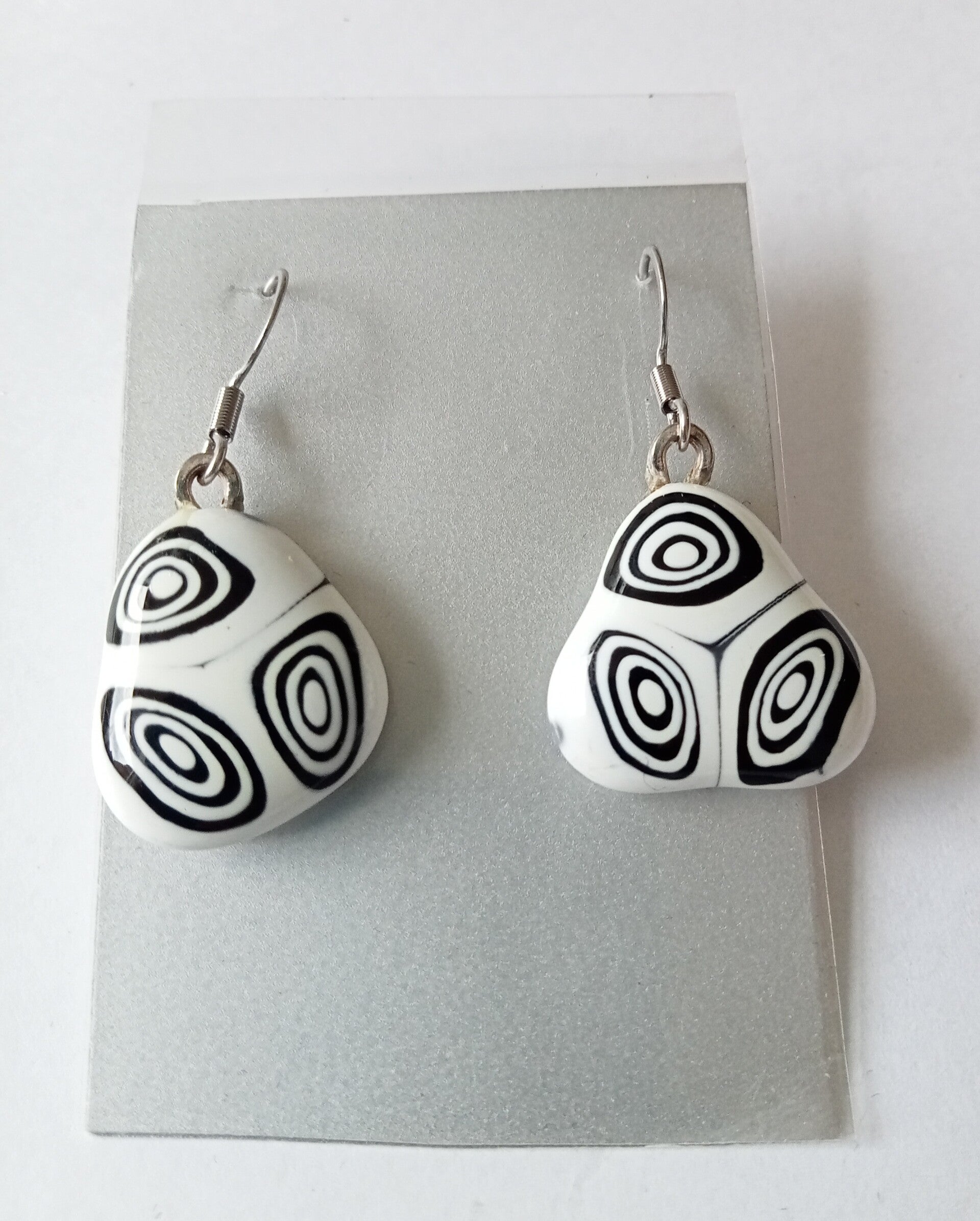 Heel aparte oorbellen gemaakt van wit glas met daarin zwarte rondjes verwerkt. De oorbellen zijn driehoekig met afgeronde hoeken. De hangers zijn 24 x 20 mm groot, de bails zijn van verzilverd metaal gemaakt en de oorhaakjes zijn van roestvrij staal (RVS of stainless steel).