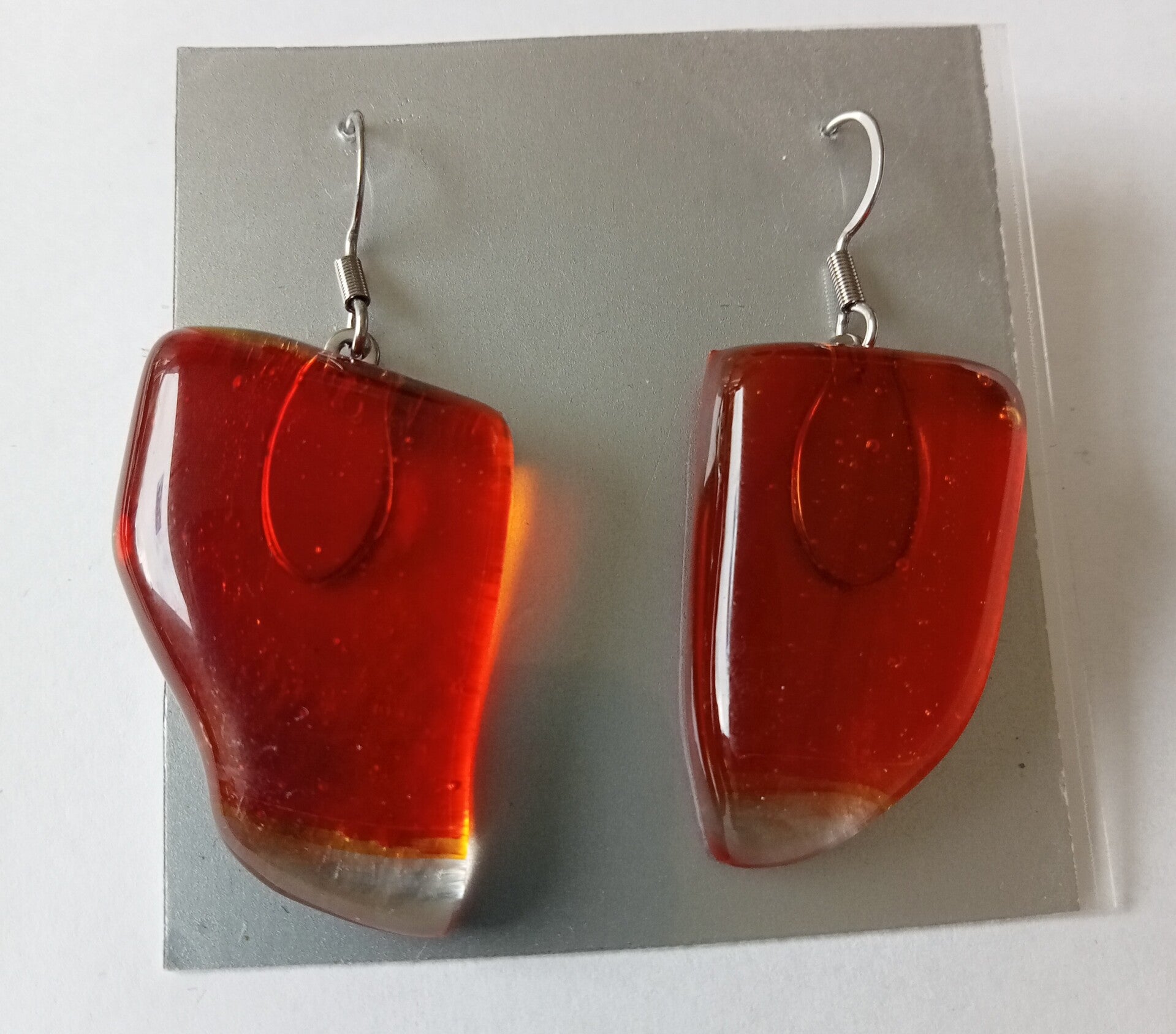 Oorbellen met een aparte vorm. De oorbellen zijn gemaakt van een laag rood en transparant glas. De oorbellen zijn niet exact gelijk van vorm, maar zijn ongeveer 35 x 22 mm groot.
