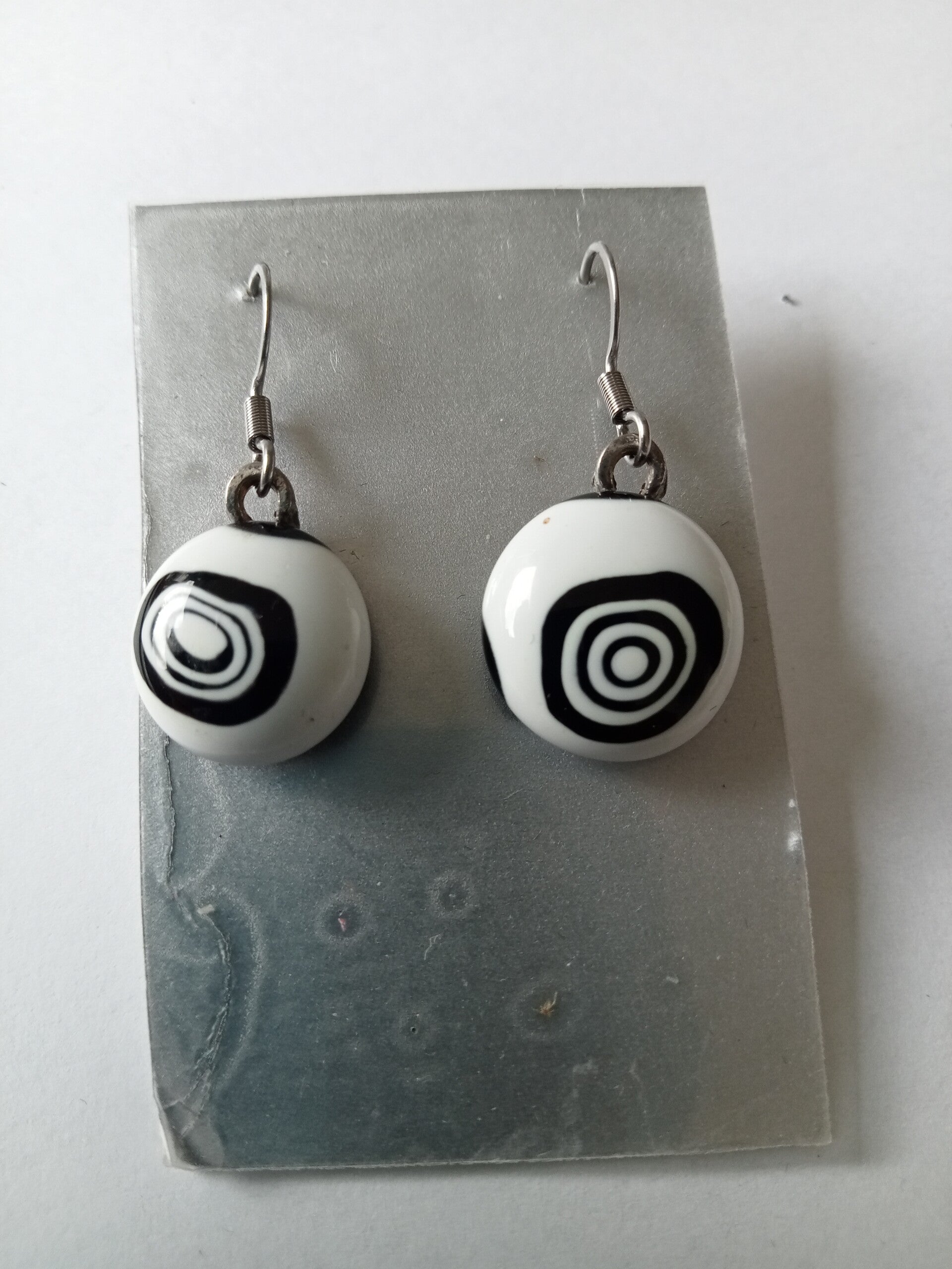 Bijzondere oorbellen gemaakt van zwart en wit glas met zwarte cirkels erin verwerkt.