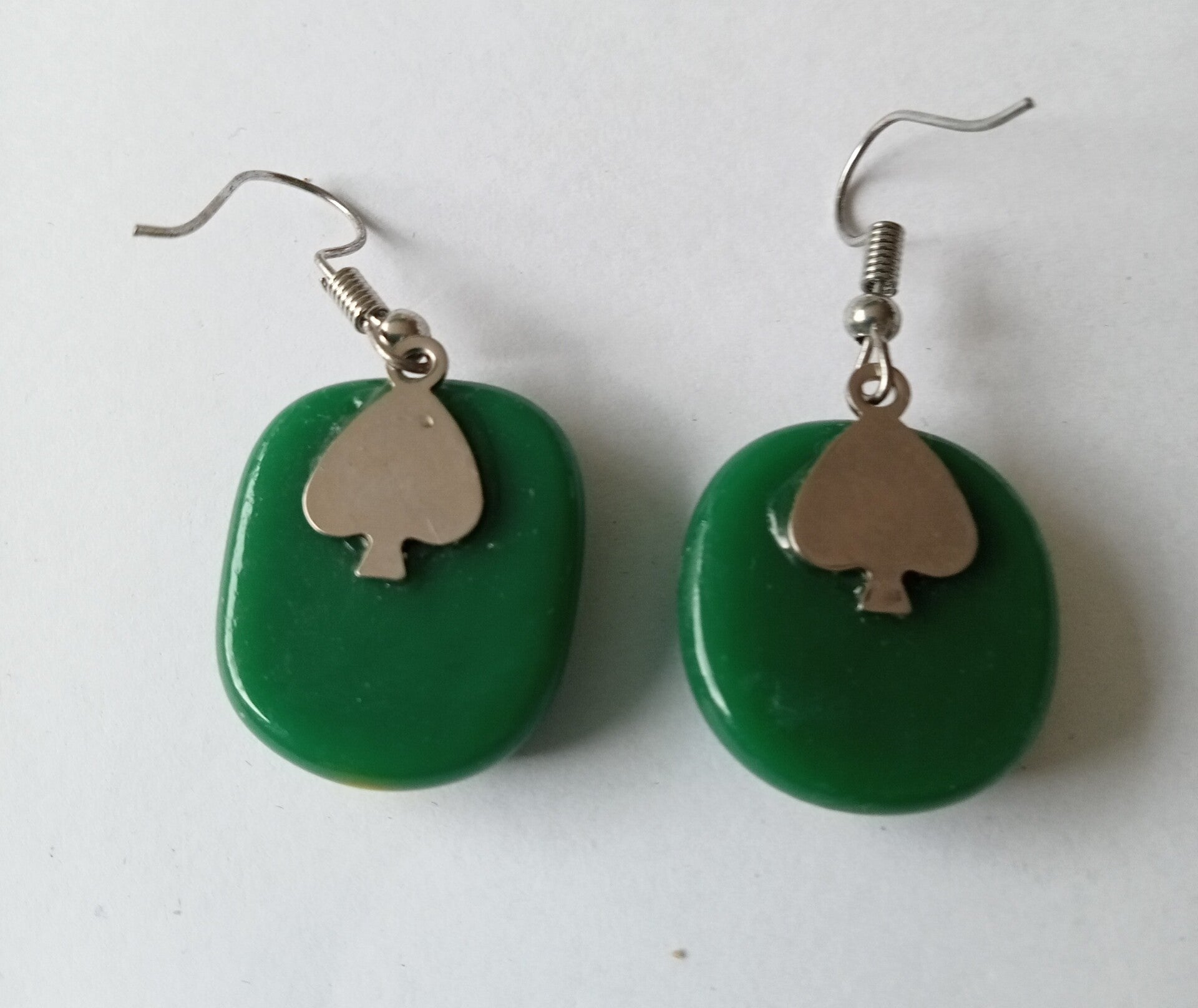 de oorbellen zijn 25 x 20 mm groot en hebben een bail van roestvrij staal (rvs of stainless steel). Ook de oorhaakjes zijn van roestvrij staal.