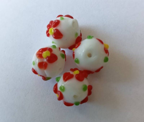 Italien style witte glaskralen rondel met rode bloemen met een geel hartje. De kralen zijn opvallend en handgemaakt. Hierdoor zijn niet alle bloemetjes even perfect.