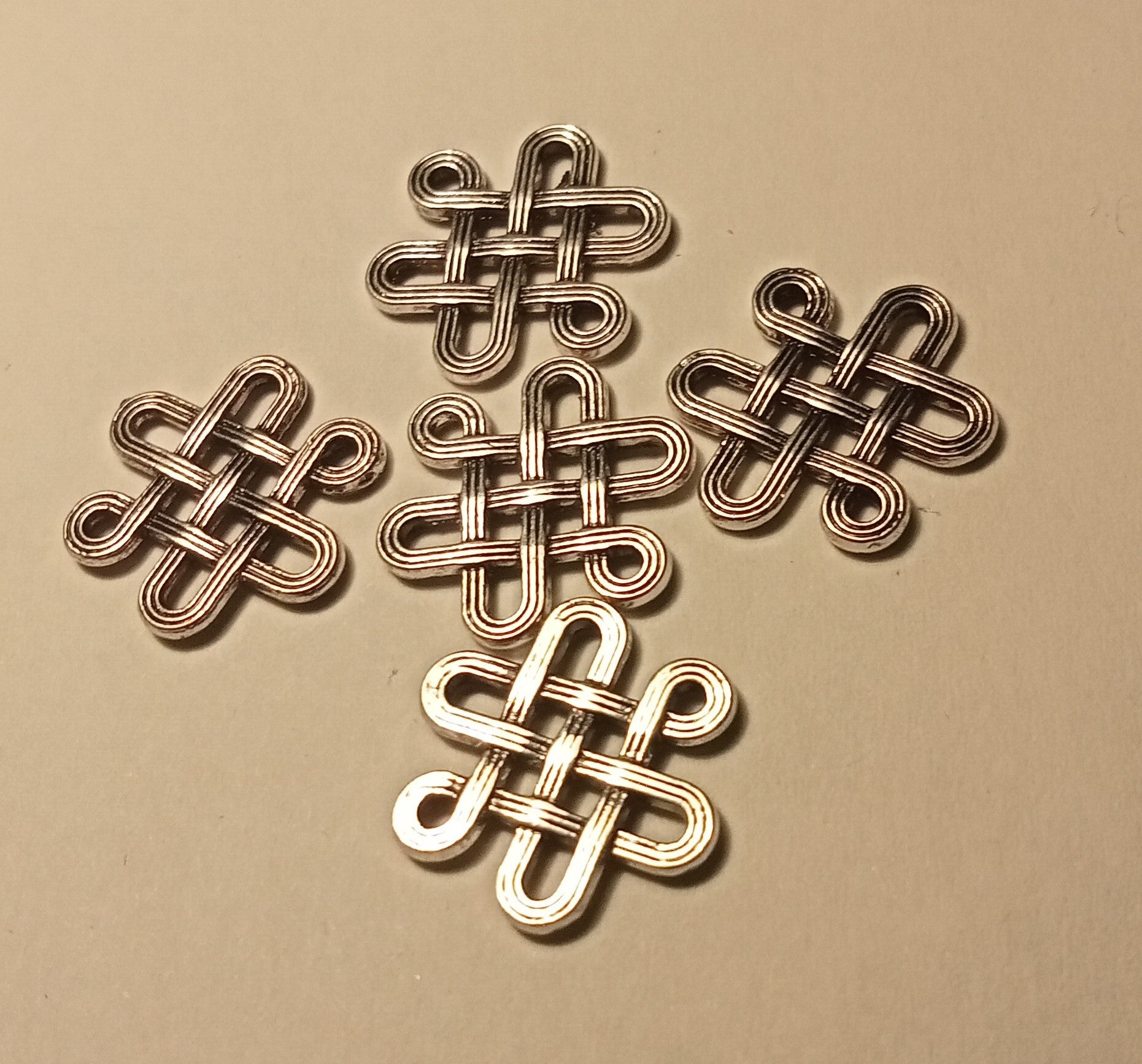 Tussenzetsel als een soort dubbele eeuwige knoop. Het tussenzetsel is strak vorm gegeven en 14 mm groot. Het tussenzetsel is gemaakt van roestvrij staal (RVS of stainless steel).