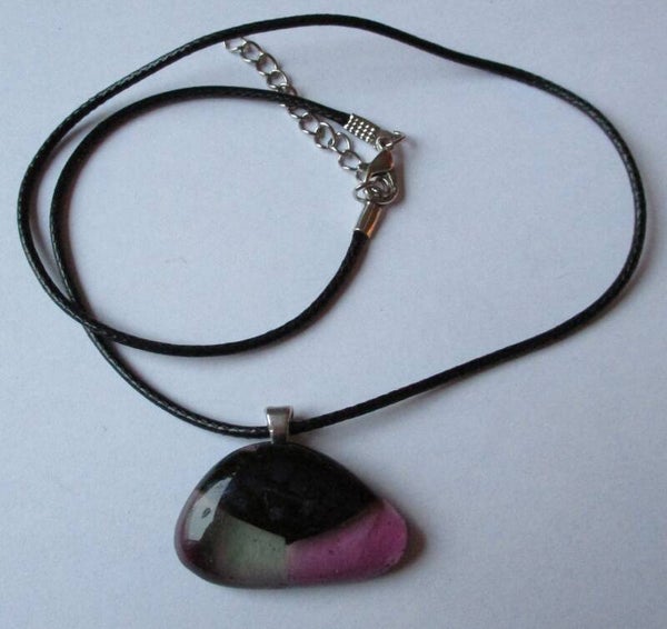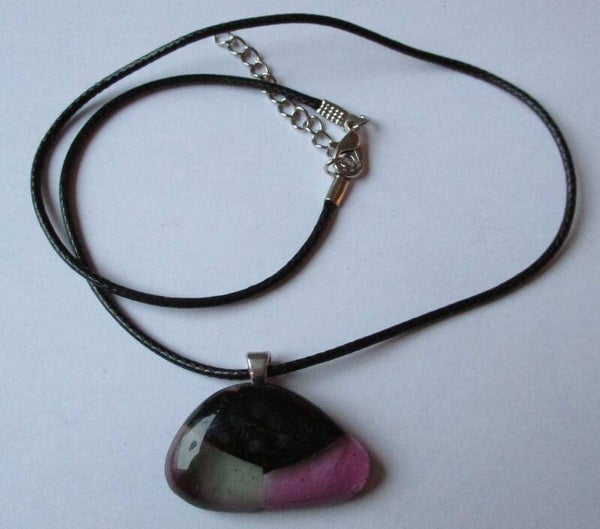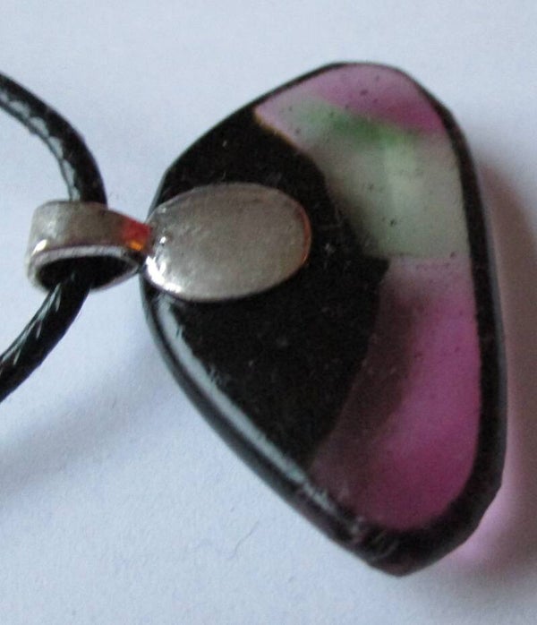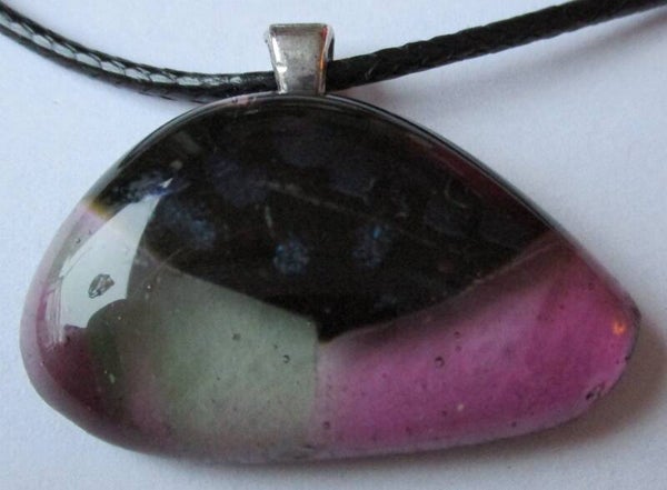 Een aparte ongeveer driehoekige hanger gemaakt van half doorzichtig groen en paars glas met aan de bovenkant een vlak van blauw gestippeld dichroïc glas. Dit geeft een licht metallic effect, maar is niet erg opvallend. De hanger is ongeveer 3,3 x 2 cm groot en hangt standaard aan een zwart namaak leren ketting. Als u liever een andere ketting wilt kunt u deze laten verwisselen bij uw bestelling voor de ketting van uw keuze.