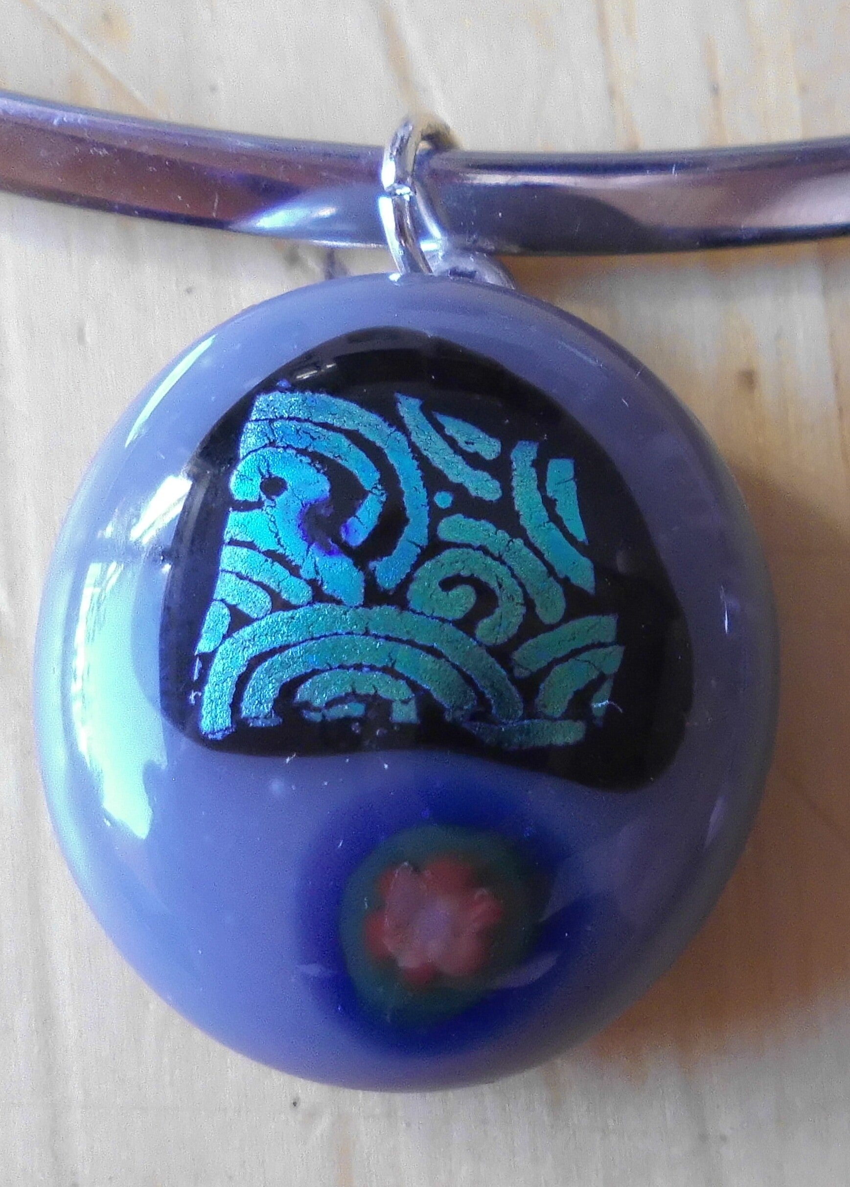 De hanger is licht ovaal en 2,3 x 2,1 cm groot en gemaakt van blauwgrijs glas. Daarop is een blauw met rode miliflori gefused en een stukje blauw dichroïc glas wat net voor een wat luxer effect zorgt.