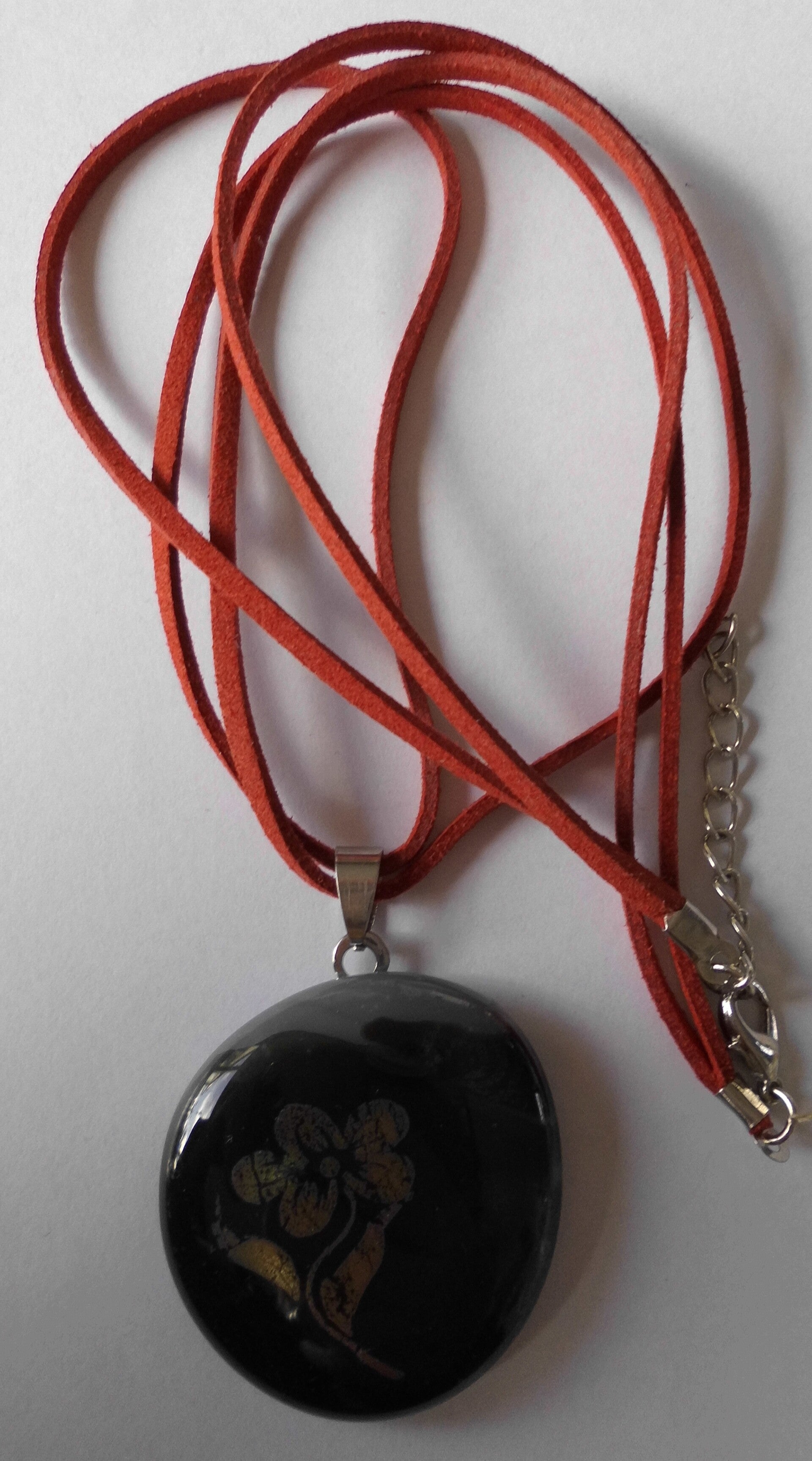 Standaard is er een ketting aan gemaakt van dubbele draad rood namaaksuede. Dit kunt u bij uw bestelling verwisselen voor de ketting van uw keuze.