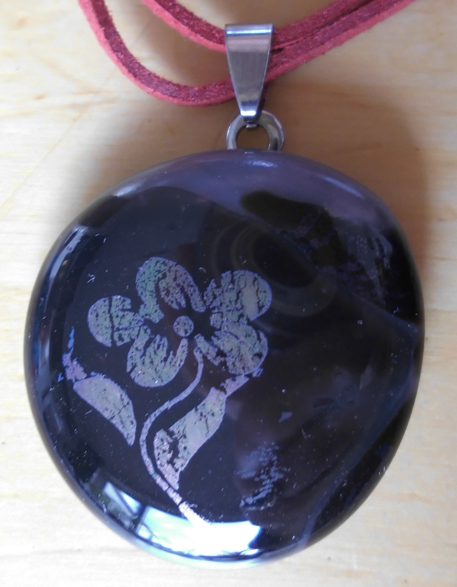 De hanger is gemaakt van zwart glas en heeft een stuk dichroïc glas in de vorm van een bloem in zich. De hanger past door de prachtige kleuren perfect bij een feestelijke outfit, maar ook bij stemmige kleding past dit heel erg goed. De hanger is ongeveer 4 x 3,7 cm groot.