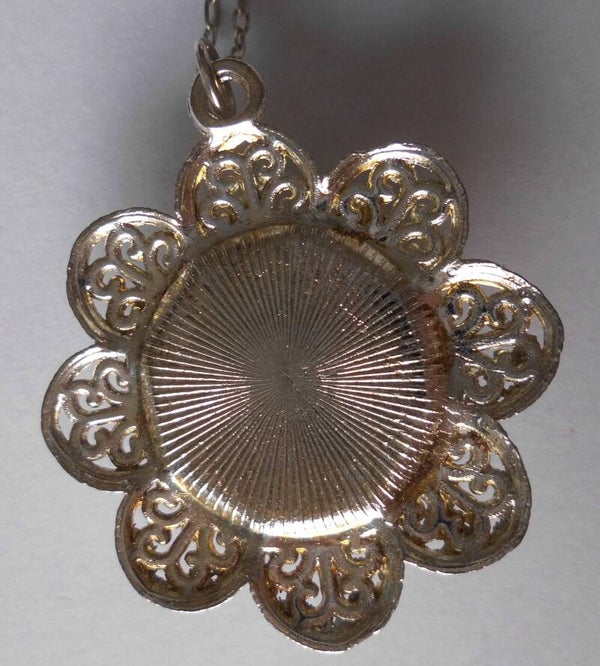 Een klassieke hanger. Een verzilverde setting in bloemvorm heeft een hart van zwart glas met een aantal gekleurde vlakjes, wat een bijzonder effect geeft. Deze hanger past bij heel veel kleuren door de verzilverde bloem en het zwarte glas.
