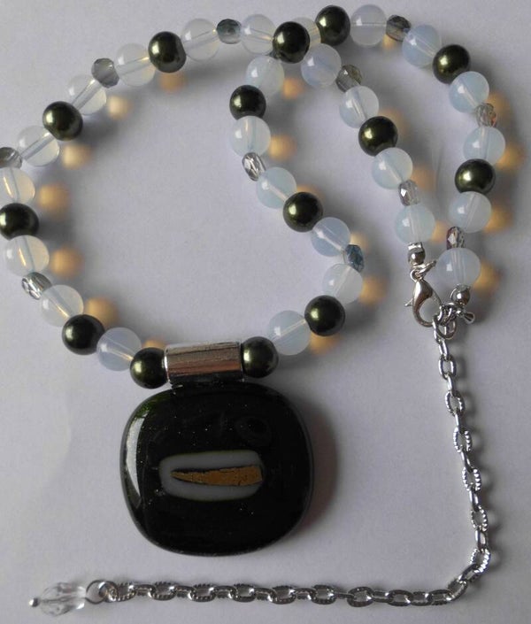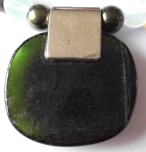 Een ketting met hanger die is gemaakt van groen glas met een licht sprankeltje erin verwerkt. In het midden van de hanger is een wit vlakje met een strookje goudkleurig dichroïc glas. Bij elkaar geeft het wel een luxe uitstraling. De hanger is 3 x 3,6 cm groot. De ketting is er afgehaald en bij uw bestelling kunt u de ketting van uw keuze doorgeven.