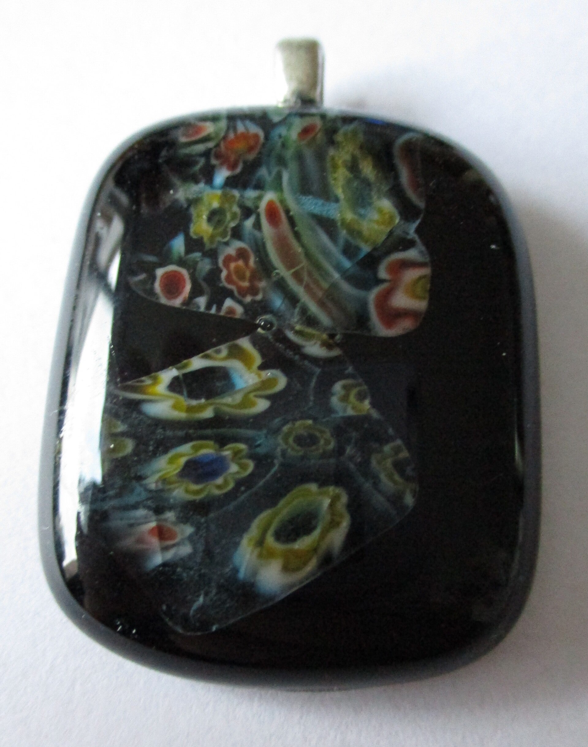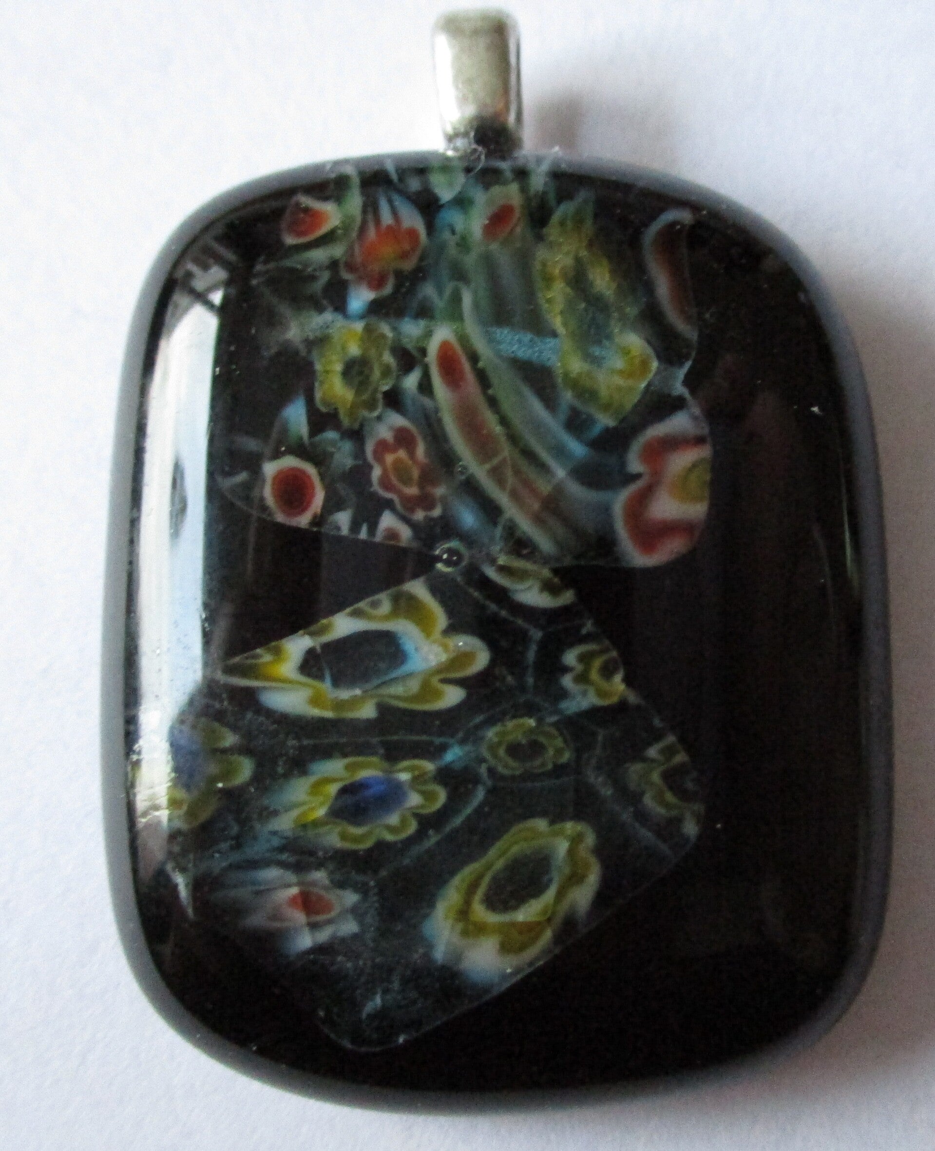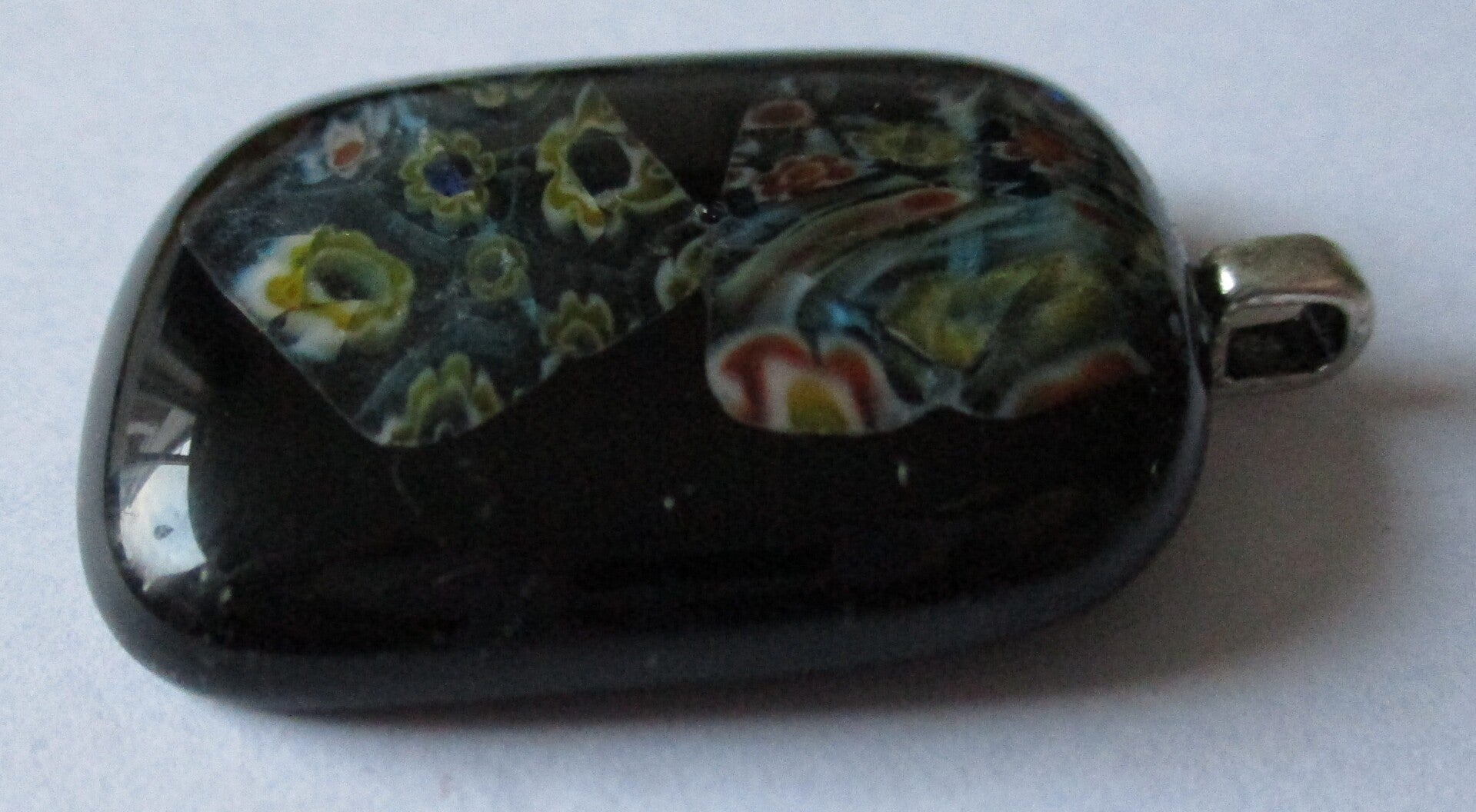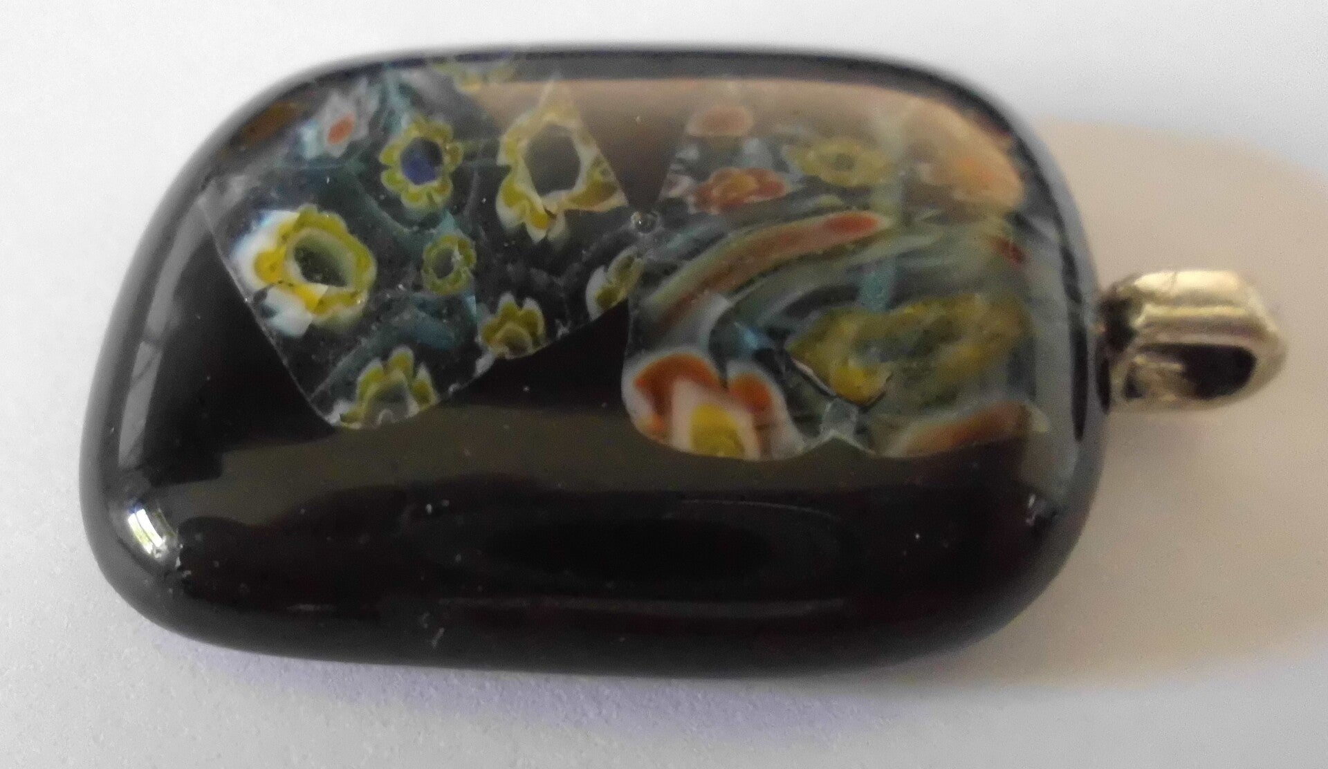 Een niet al te opvallende hanger, door de donkere kleuren, maar wel een die heel fleurig is. Vierkante miliflori zijn op een rechthoekig stuk zwart glas gesmolten met erover heen nog een transparante laag. Een prachtige hanger bij uw herfstoutfit.