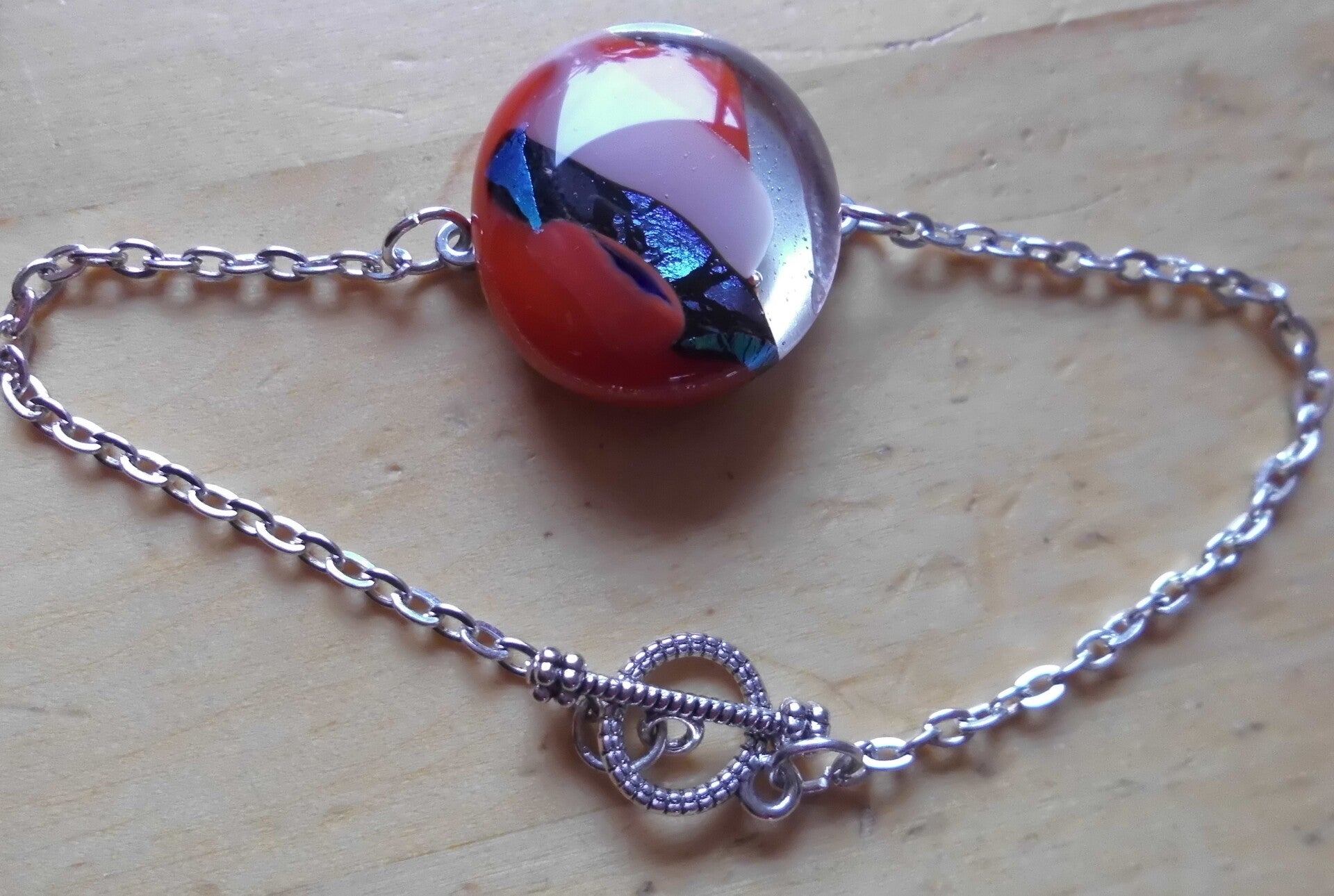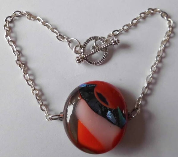 Een armbandje met een beetje luxe uitstraling. De armband is verzilverd en heeft een ovaal schakeltje. De hanger is gemaakt van oranje glas met een paar gekleurde vlakken, wat de luxe uitstraling versterkt. De armband heeft een fijne kapittelsluiting en is 18 cm lang. Het slot kan bij bestelling worden vervangen door een karabijnslot of drukknoop sluiting.