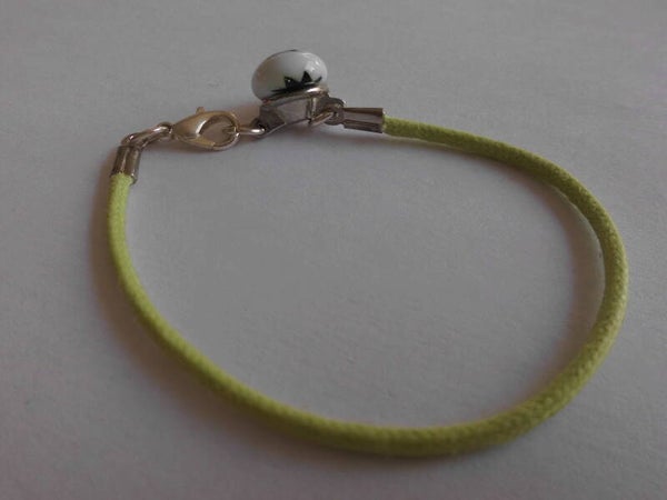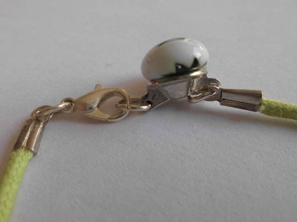 Een apart armband gemaakt van groen namaak suède met een ovale hanger gemaakt van wit glas met groene miliflori bloemen. De sluiting van deze armband is direct aan de hanger gemaakt, wat een bijzonder effect geeft, maar wel iets makkelijker is met openen en sluiten.