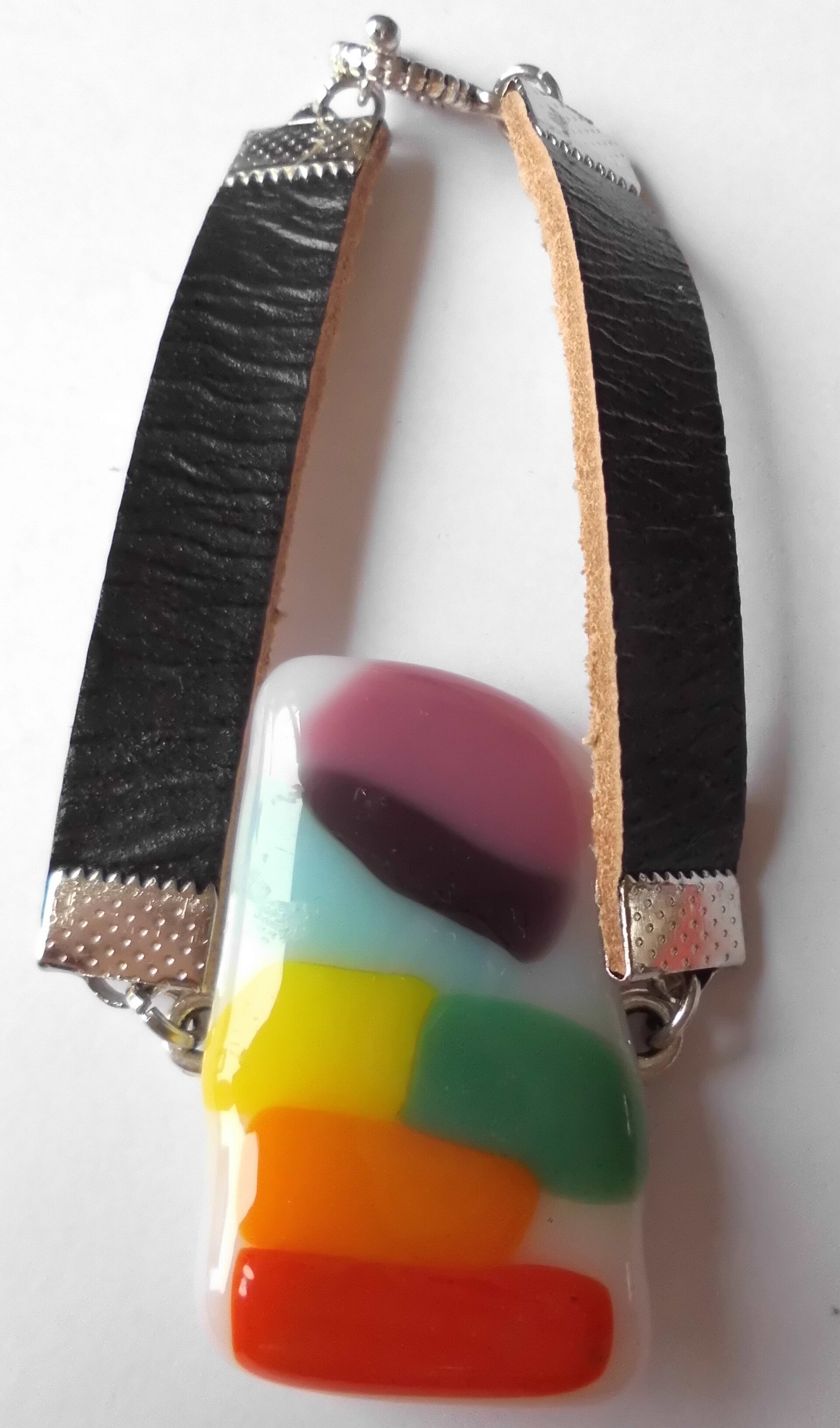 Een stoere armband, gemaakt van 1 cm breed zwart imitatieleer. De armband heeft in het midden een hanger gemaakt van witglas met stukjes glas in regenboogkleuren. Het geeft de armband direct ook een symbolische uitstraling en is ook door mannen prima draagbaar. De armband heeft een kapittelsluiting.