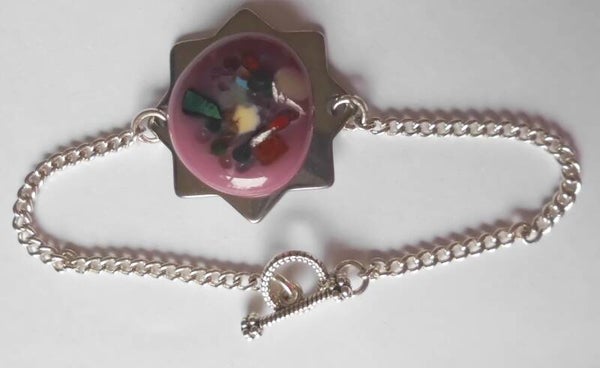Het hart wordt gevormd door een stervormig zilverkleurig en licht gebogen tussenzetsel waarop een lichtpaarse hanger is gemaakt met gekleurde spikkels.
