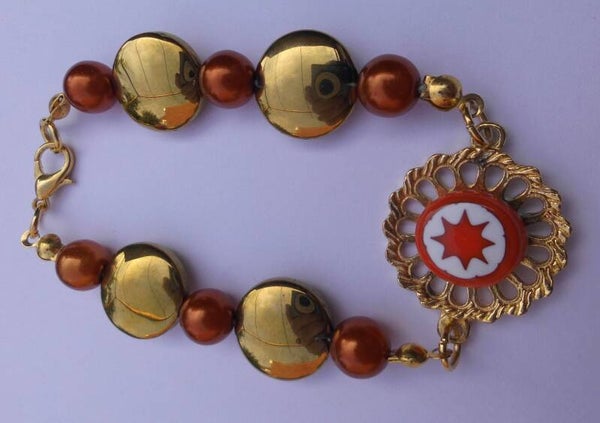 Een leuke armband met een beetje klassieke uitstraling. De armband is gemaakt van oranje en goudkleurige kralen met een goudkleurige bloemvormige bail en een oranje met witte glazen bloem als detail. De armband is 18,5 cm lang en kan met een verlengkettinkje langer gemaakt worden. Korter maken kan helaas niet.