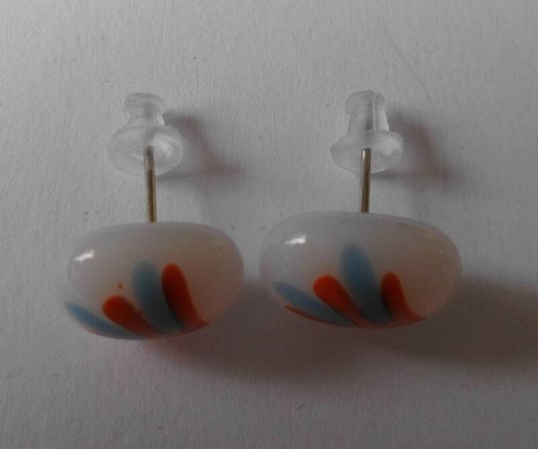 Mooie witte ovale oorknoppen met een soort patroontje van oranje en blauwe streepjes. De oorknoppen zijn ongeveer 1,3 x 1 cm groot en passen heel goed bij witte en zomers gekleurde kleding. Er zitten rubberen stoppertjes bij.