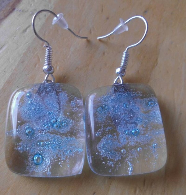 Bijzondere oorbellen, gemaakt van transparant glas met ertussen blauwe bubbeltjes, alsof het water is. Een speciaal en luxe effect. De hangers zijn ongeveer 2,5 x 2 cm groot en hebben een roestvrijstalen bail. De oorhaakjes zijn verzilverd en kunnen bij bestelling ook verwisseld worden voor clips.
