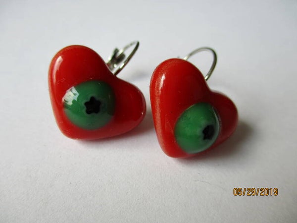 Rode hart oorbellen met groene milliflori 55479a