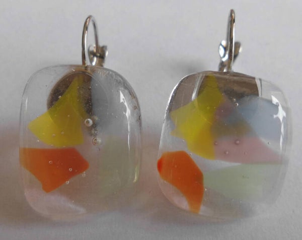 Een paar zomerse oorbellen gemaakt van transparant glas met daartussen kleine stukjes glas in pastelachtige regenboogkleuren. De kleuren liggen door elkaar heen. De oorhangers zijn ongeveer 2 x 1,5 cm groot.