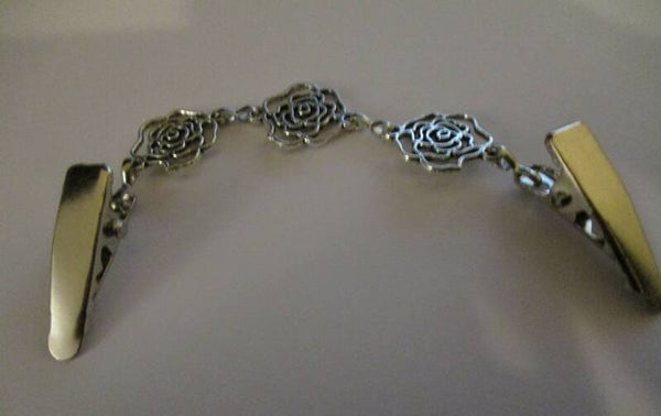 Leuke zilverkleurige vestklem met tussen de haakjes een rijtje van 3 open gewerkte roosjes. De klemmetjes zijn stevig, maar niet te strak om makkelijk open en dicht te maken.