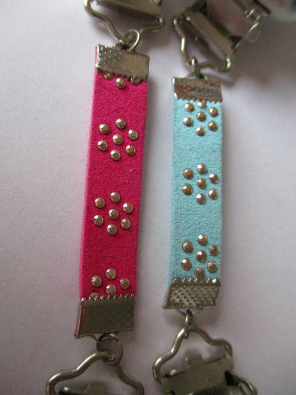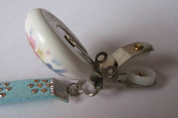 Een vestklem gemaakt van 2 witte houten klemmen met vrolijk gekleurde bloemetjes erop. Ertussen is een stukje donkerroze of lichtblauw namaak suéde band gemaakt met goudkleurige studs in de vorm van een bloemetje.
