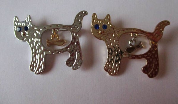 Een grappige broche in de vorm van een poes met een visje in haar buik. De poes is goud of zilverkleurig, het visje juist de andere kleur. De poes heeft oogjes van kleine blauwe strass steentjes. De broche is 4 x 3 cm groot en heeft een veiligheidslot.