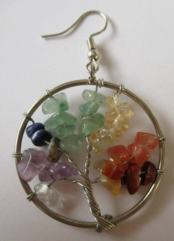 Mooie oorbellen gemaakt in de vorm van een levensboom met natuursteentjes als takken aan de boom. De steentjes zijn: bergkristal, amethist, sodaliet, aventurijn, citrine, agaat en jaspis. De hangers zijn 4 cm groot.