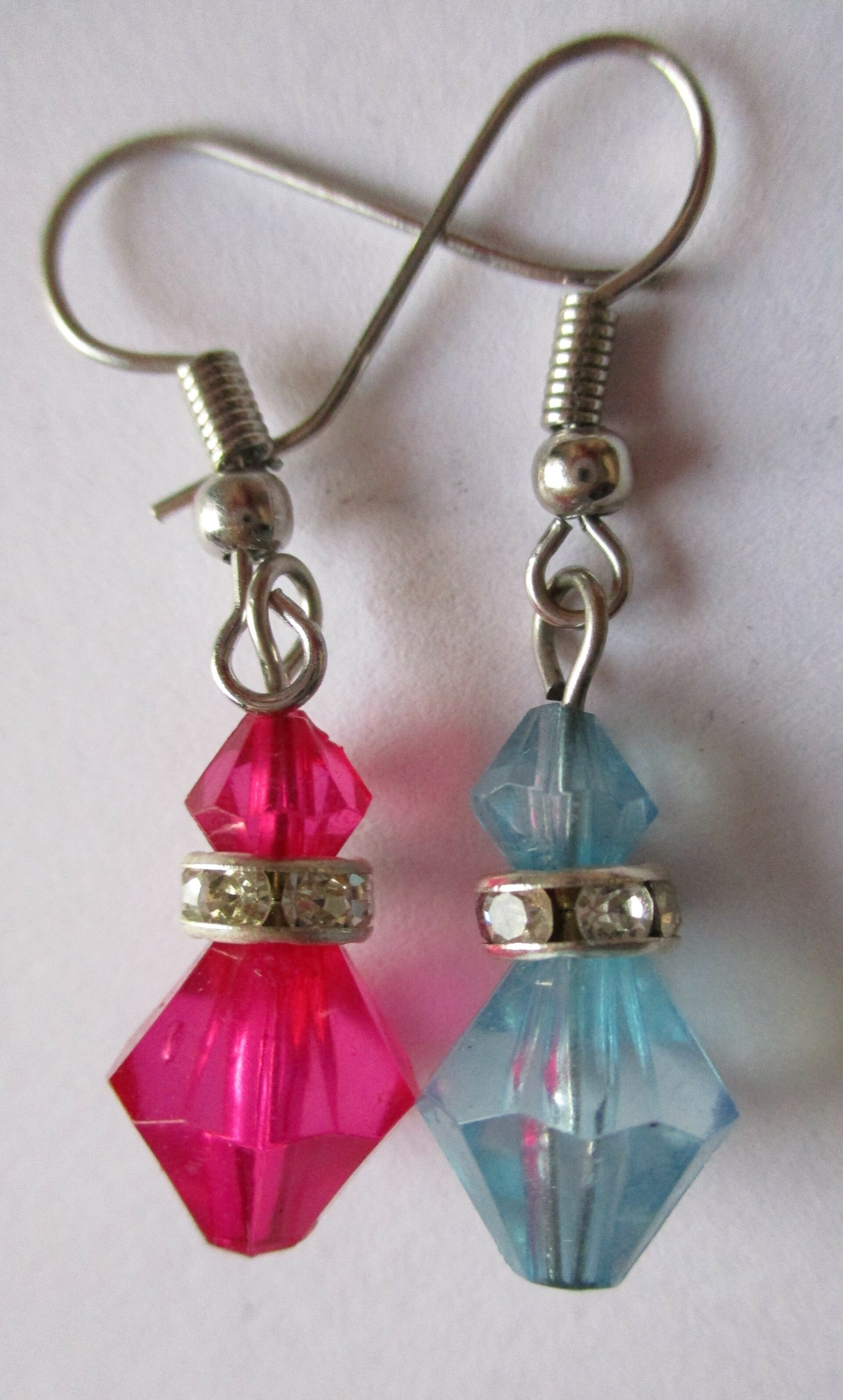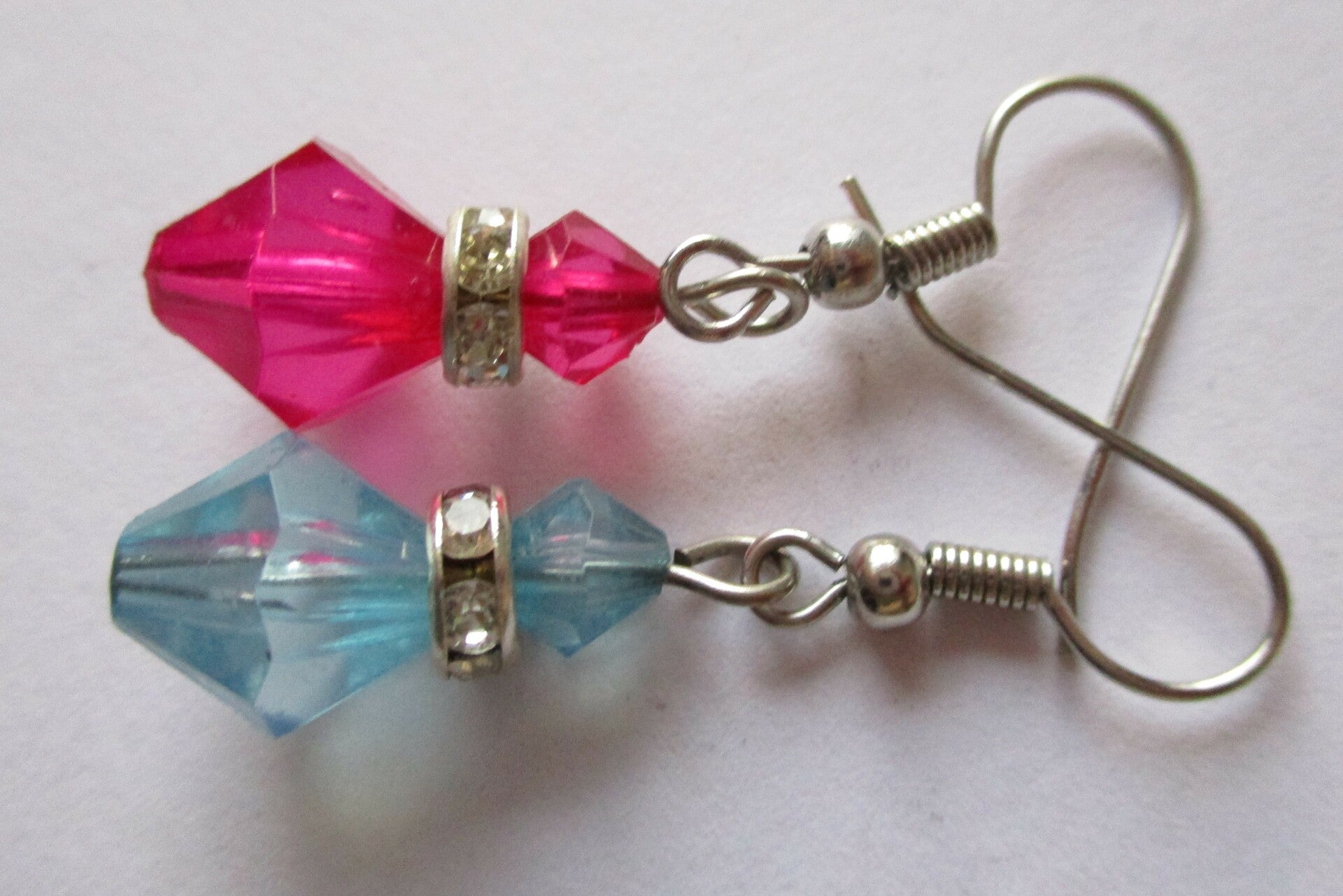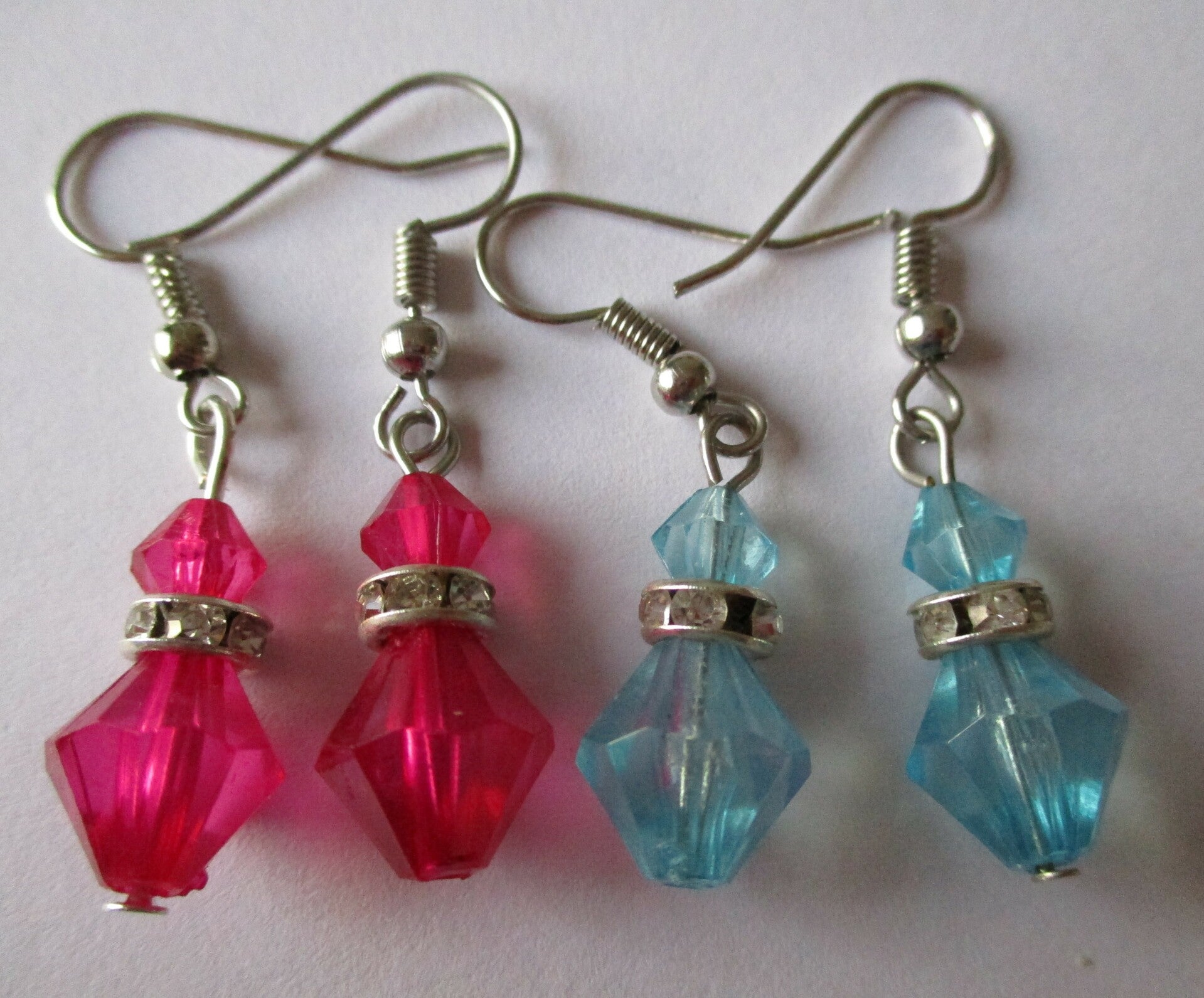 Hele simpele oorbellen, maar toch met een beetje uitstraling en bling effect. De hangers zijn gemaakt van 2 kunststof bicone kralen, facet geslepen, met een stras rondelle spacer kraal in het midden. De hanger is ongeveer 2 cm lang.