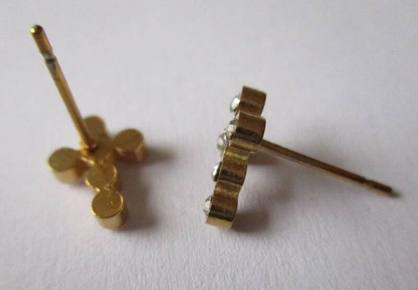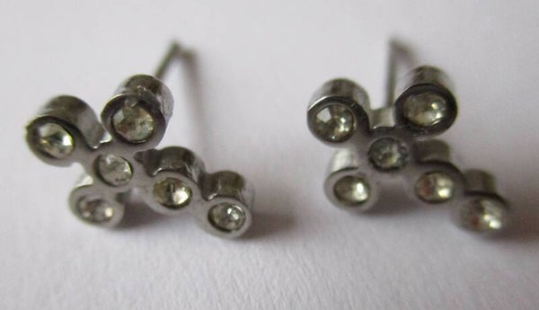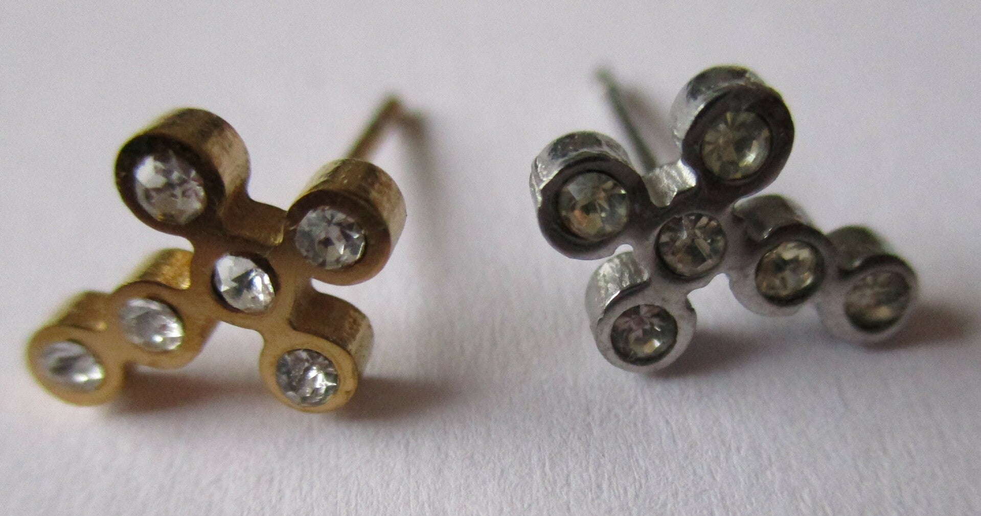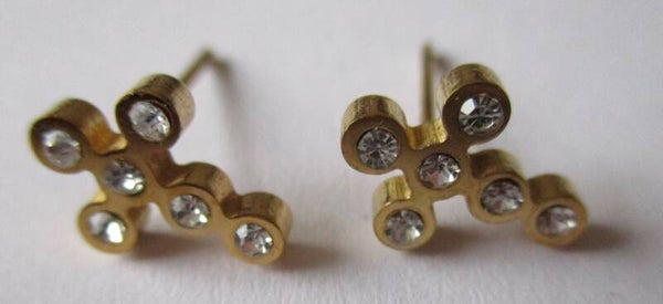 RVS oorstekers (Roestvrij staal of stainless steel) die veilig te dragen zijn door mensen met een metaal allergie. De oorstekers hebben de vorm van een klein kruisje met hele kleine stras steentjes erin. De kruisjes zijn ongeveer 12 x 8 mm groot. We hebben ze in goud en zilverkleur.