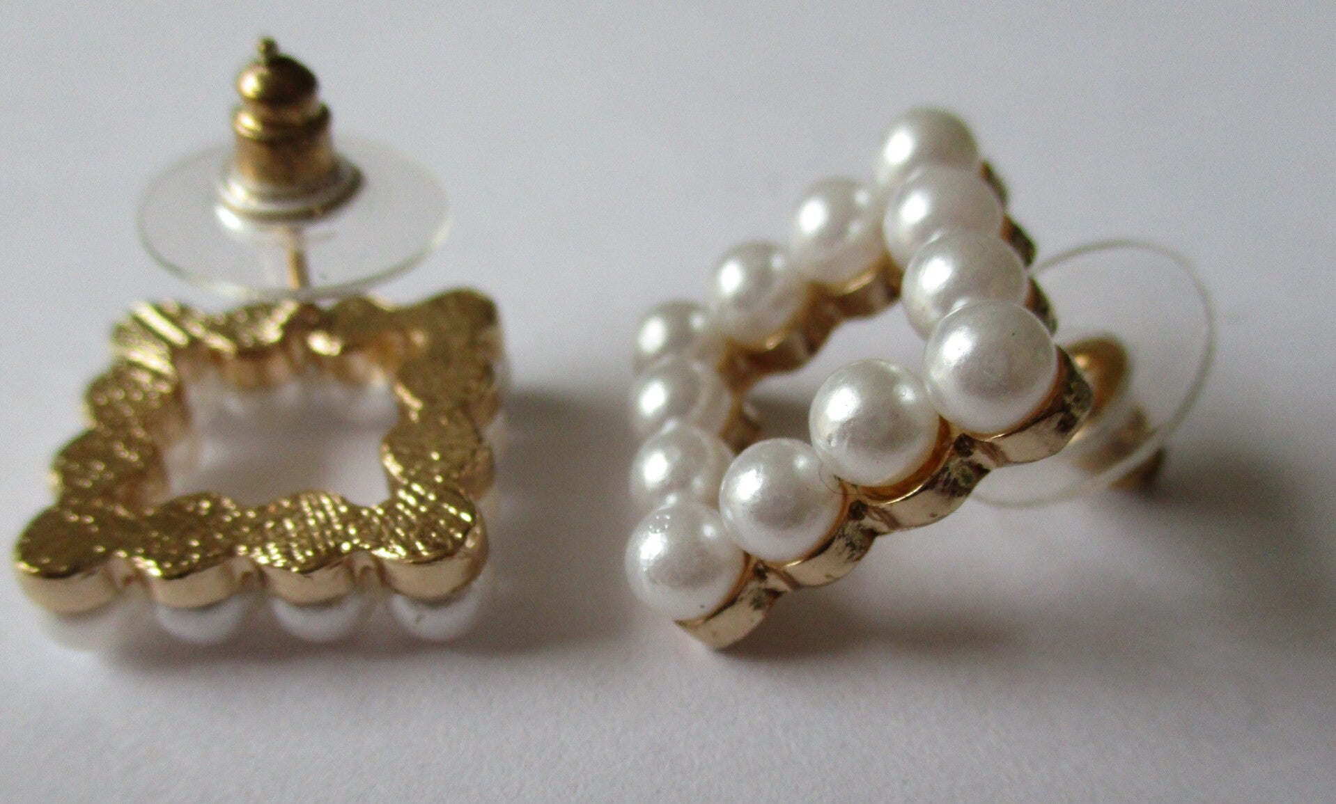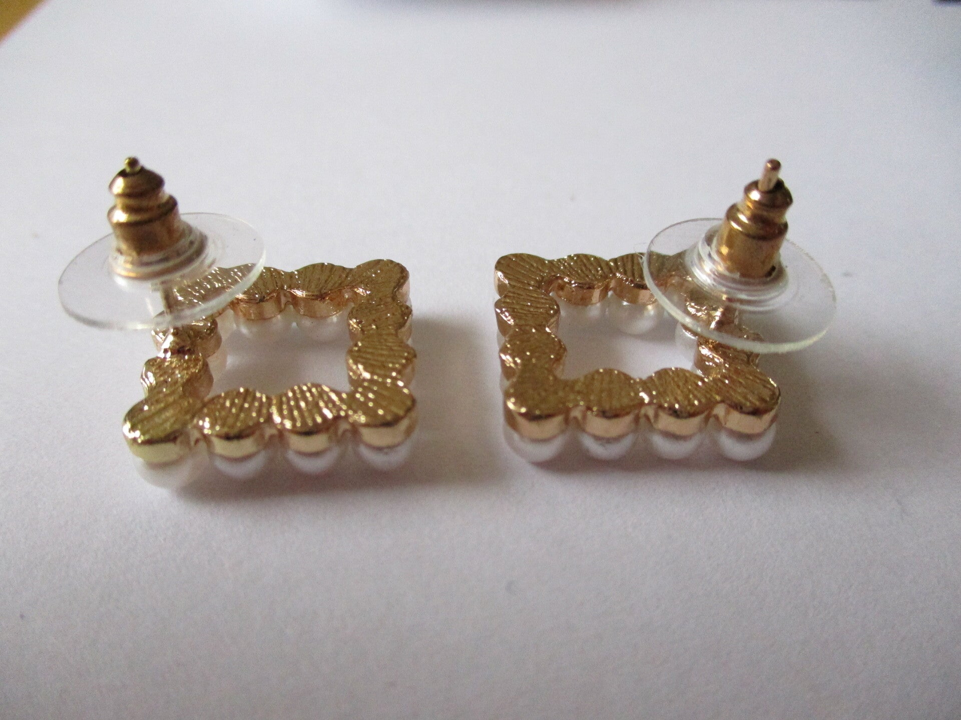 Aparte modern vormgegeven oorstekers, gemaakt van goudkleurig nikkelvrij metaal. De oorstekers zijn vierkant met kleine kunststof pareltjes. Het geeft een wat luxe uitstraling. De oorstekers zijn ongeveer 16 x 16 mm groot.
