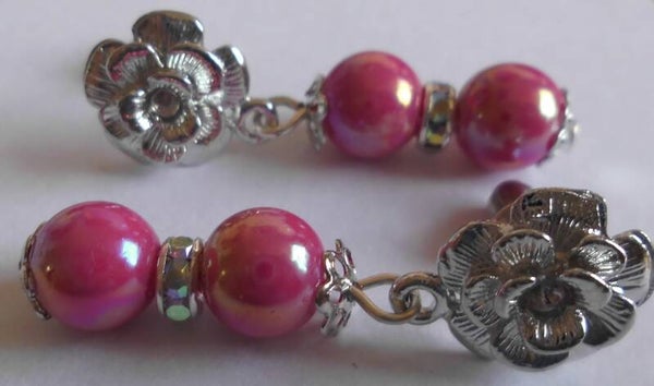 Een mooi zilverkleurig roosje als oorsteker waaraan een stift met roze kunststof kralen en een spacer met strass steentjes bungelt. Het maakt iets luxe, maar ook vrolijk gekleurde oorbellen.