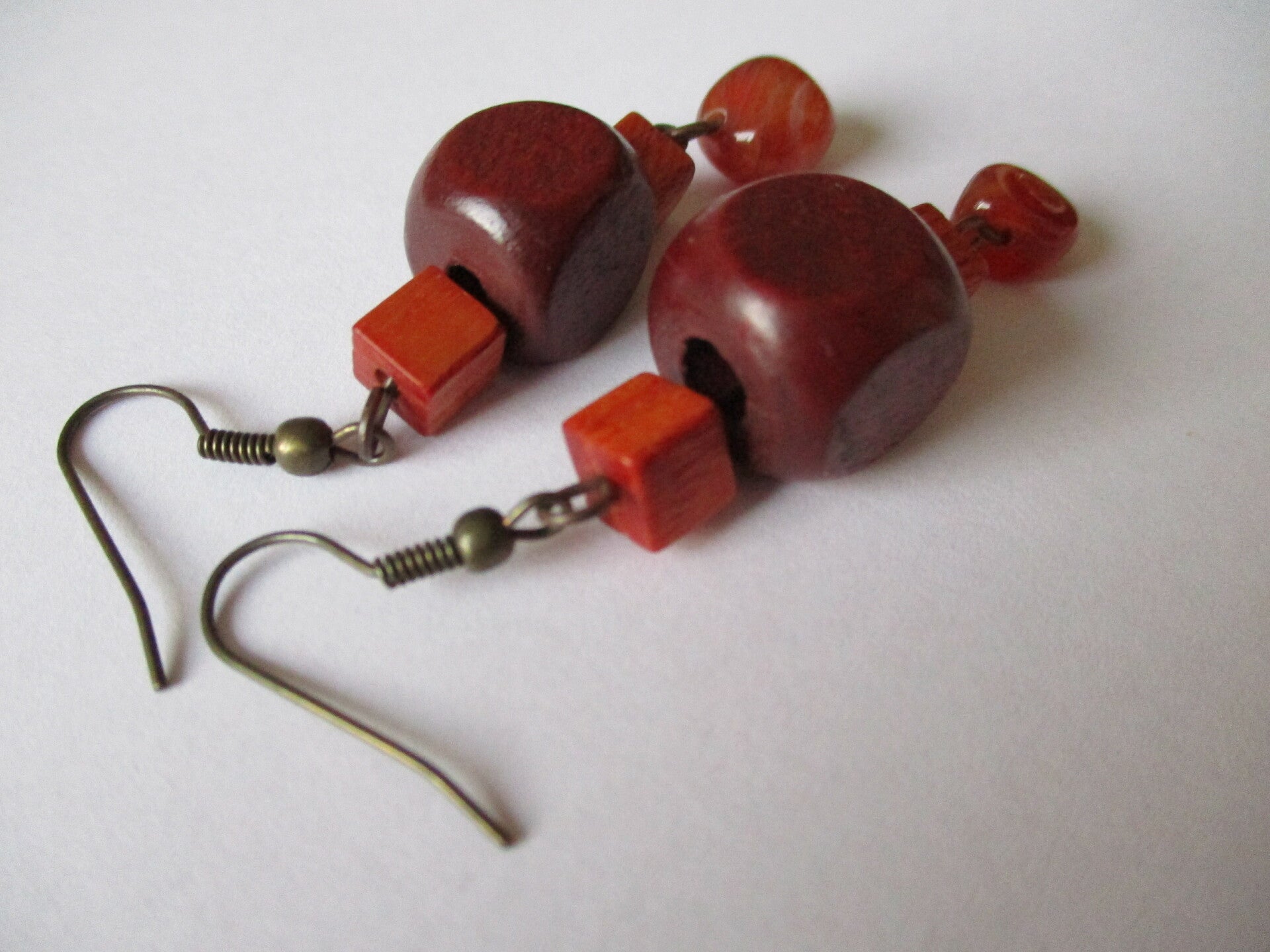Leuke oorbellen voor iemand die vooral van natuurlijk materialen houdt. De hangers zijn gemaakt van verschillende houten kralen met eronder een klein agaat steentje en zijn ongeveer 4,2 cm lang.