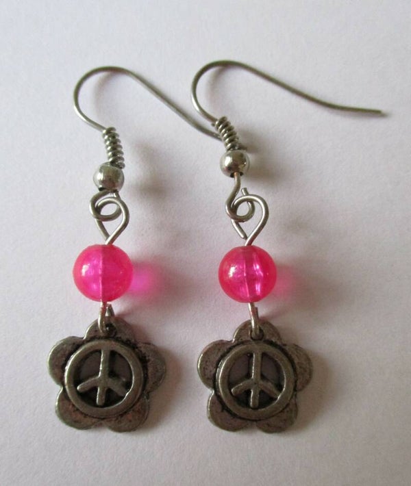 Een niet al te opvallend paar oorbellen met een kunststof roze kraal met eronder een peace teken in bloemvorm. De hanger is 2,5 cm lang en gemaakt van nikkelvrij materiaal. De haakjes kunnen bij bestelling verwisseld worden voor knopjes, clips, echt zilveren of RVS haakjes (beide tegen meerprijs)
