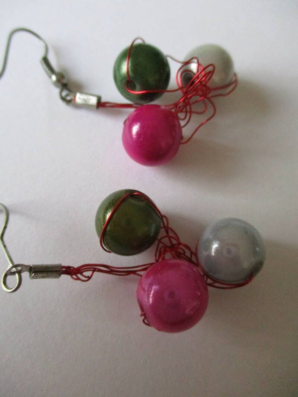 Grappige en unieke oorbellen die gemaakt zijn van rood, gecoat metaaldraad met eraan 3 gekleurde miracle beads. Het metaaldraad is gekrinkeld en kan altijd met de hand een beetje meer of minder in elkaar gekrinkeld worden, waardoor ze wat korter of langer worden. De haakjes zijn gemaakt van nikkelvrij materiaal en kunnen verwisseld worden bij bestelling.