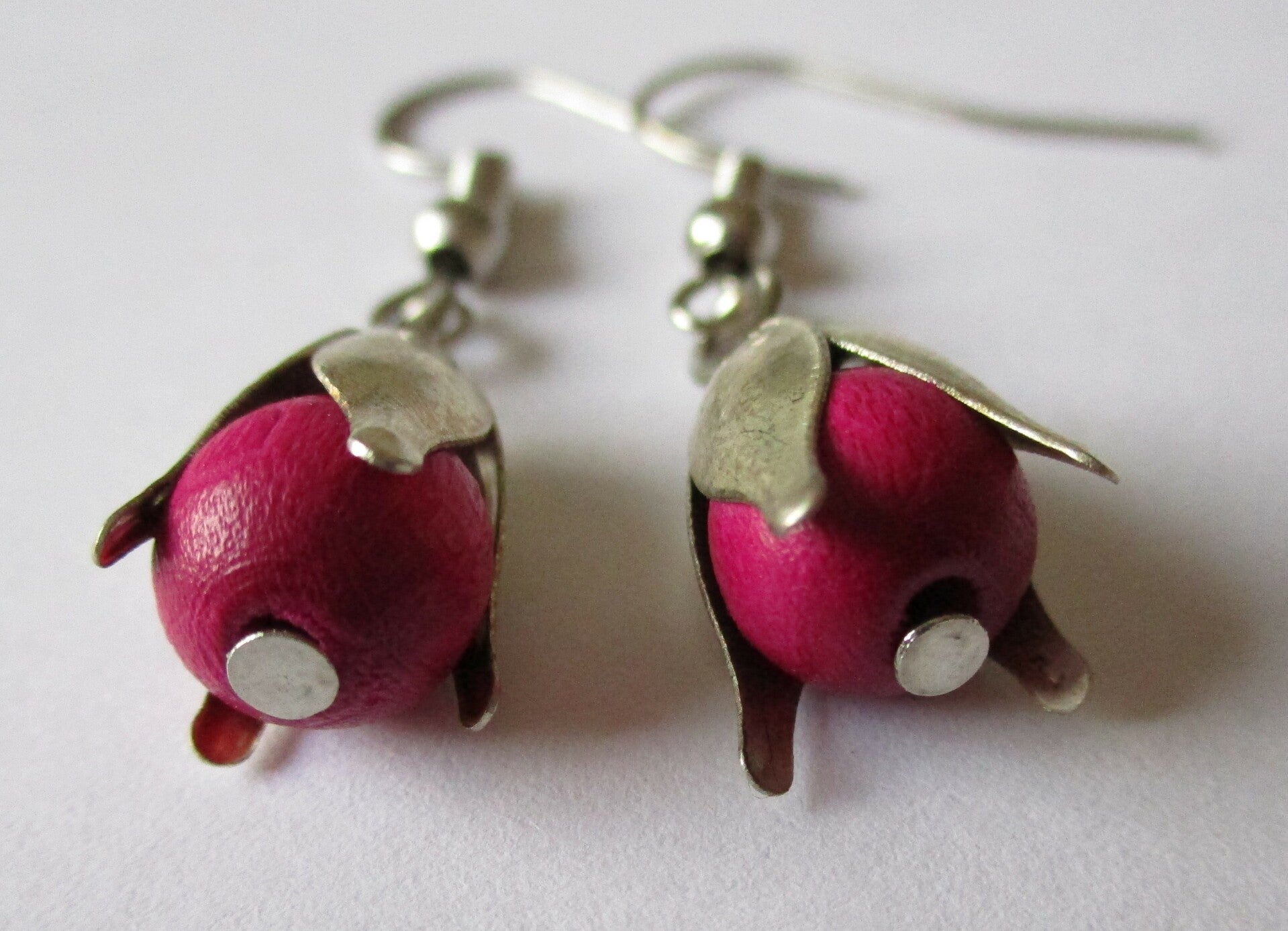 Leuke, unieke oorbellen, gemaakt van een verzilverd, tulpvormig kapje met erin een fuchsia roze houten kraal. Het heeft het effect van een soort hangende bloem. De hanger is 2 cm lang. De haakjes zijn gemaakt van nikkelvrij materiaal en kunnen bij bestelling verwisseld worden.