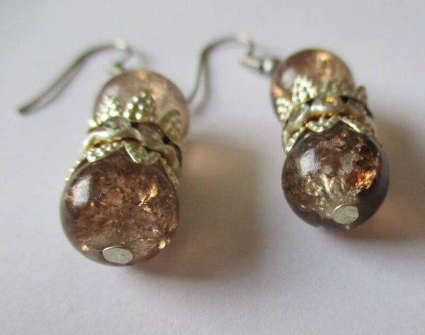 Klassiek ogende oorbellen, gemaakt van twee taupe kleurige half doorzichtige glaskralen met een tussenlaagje met kleine stras steentjes. In de kralen zit een soort glinstereffect. Het maakt dat de oorbellen prima passen bij een feestelijke outfit waar je mag schitteren. De oorhaakjes zijn gemaakt van nikkelvrij materiaal en kunnen bij bestelling verwisseld worden voor clips, knopjes of echt zilveren of rvs haakjes (tegen meerprijs).
