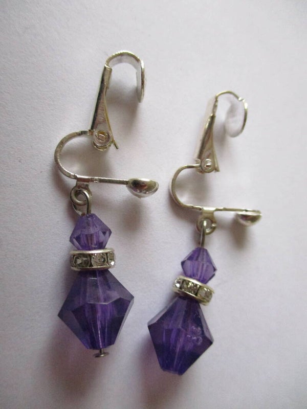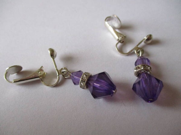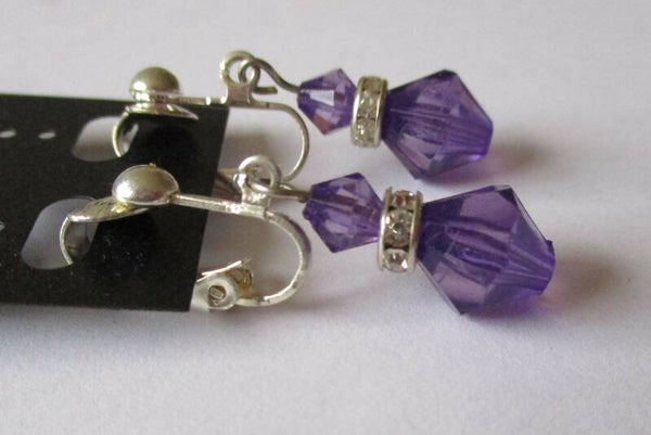 Verzilverde oorclips met een hanger van kunststof paarse hexagon kralen met een ronde stras rondelle ertussen. De kleine stras steentjes zorgen voor een beetje een bling effect. De hanger is ongeveer 2,2 cm groot. De clips kunnen bij uw bestelling worden vervangen door oorhaakjes of oorknopjes. Echt zilveren oorhaakjes zijn ook mogelijk, tegen meerprijs.