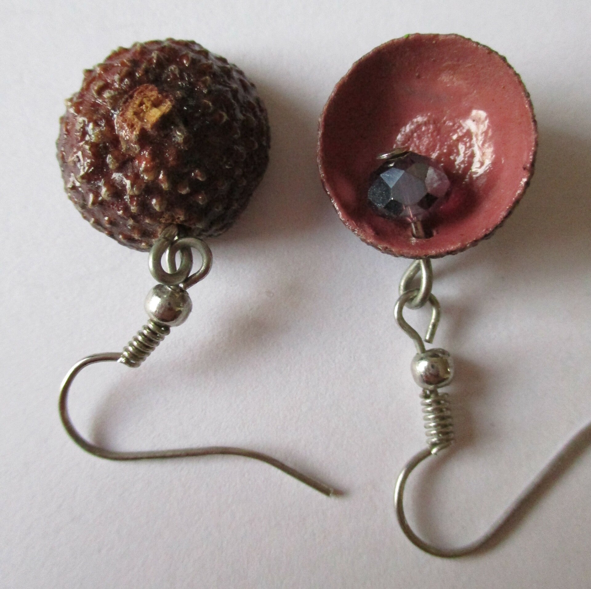 Aparte oorbellen met een natuurlijke uitstraling. De hangers zijn gemaakt van eikelkapjes die gelakt zijn. De buitenkant transparant en de binnenkant met oudroze lak. Erin hangt een klein zilverkleurig facetgeslepen kraaltje. Deze oorbellen passen heel goed bij een outfit met mooie oudroze herfstkleuren.
